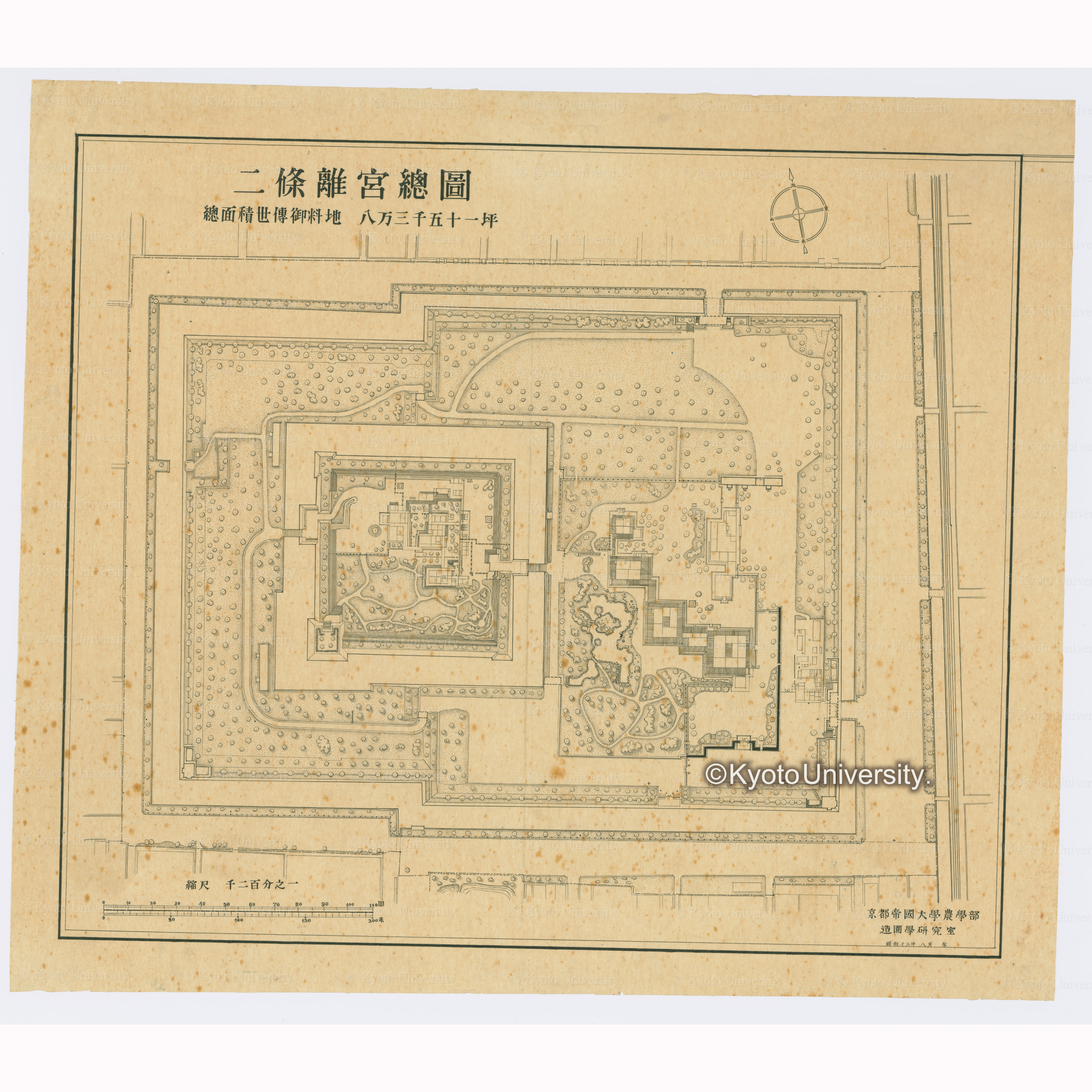 二条離宮総図 総面積世代御料地 八万三千五十一坪 縮尺千二百分之一 京都帝国大学農学部 造園学研究室 昭和十三年八月写, 昭和13年8月.