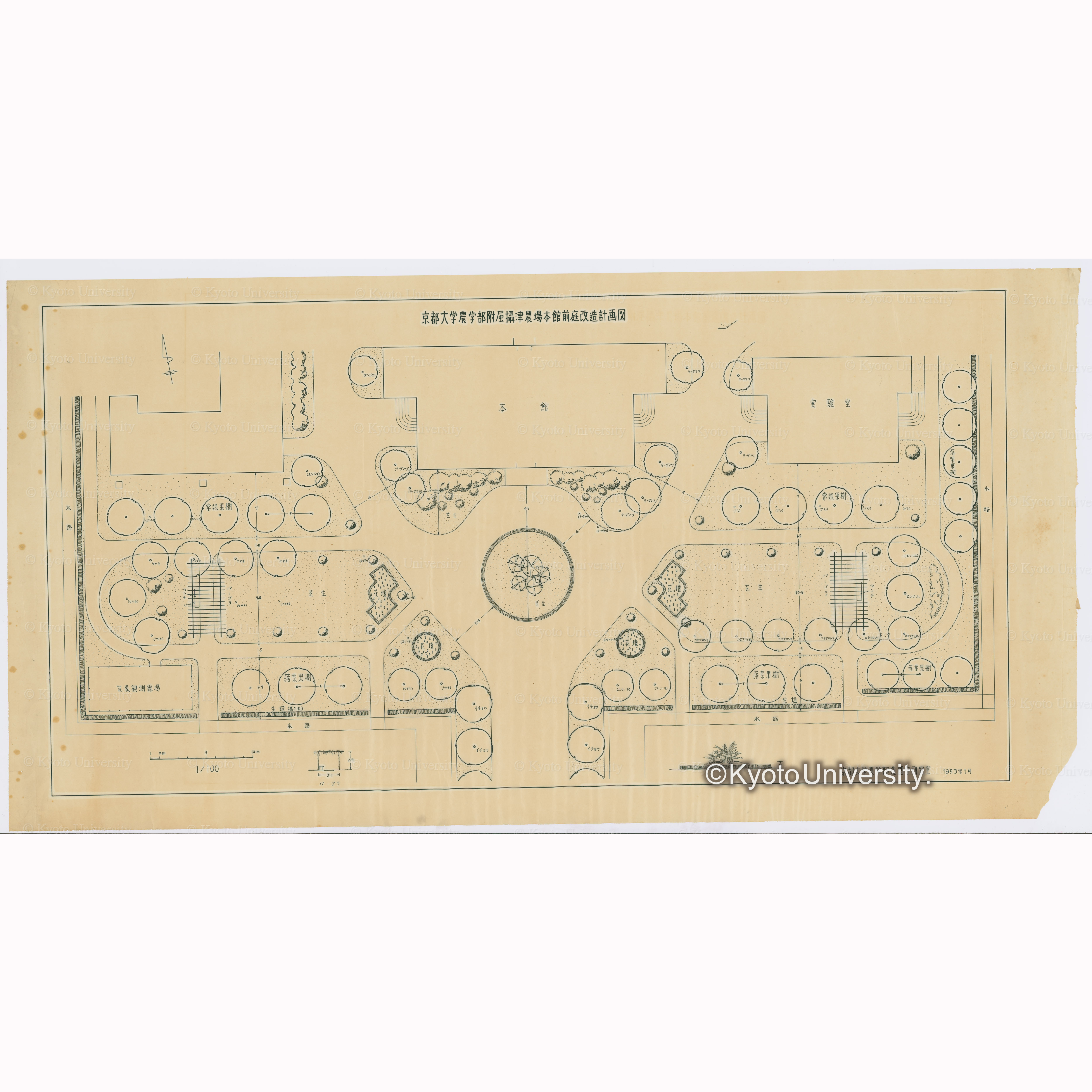 京都大学農学部附属摂津農場本館前庭改造計画図 京都大学農学部造園学研究室 1953年1月 1/100, 昭和28年1月.