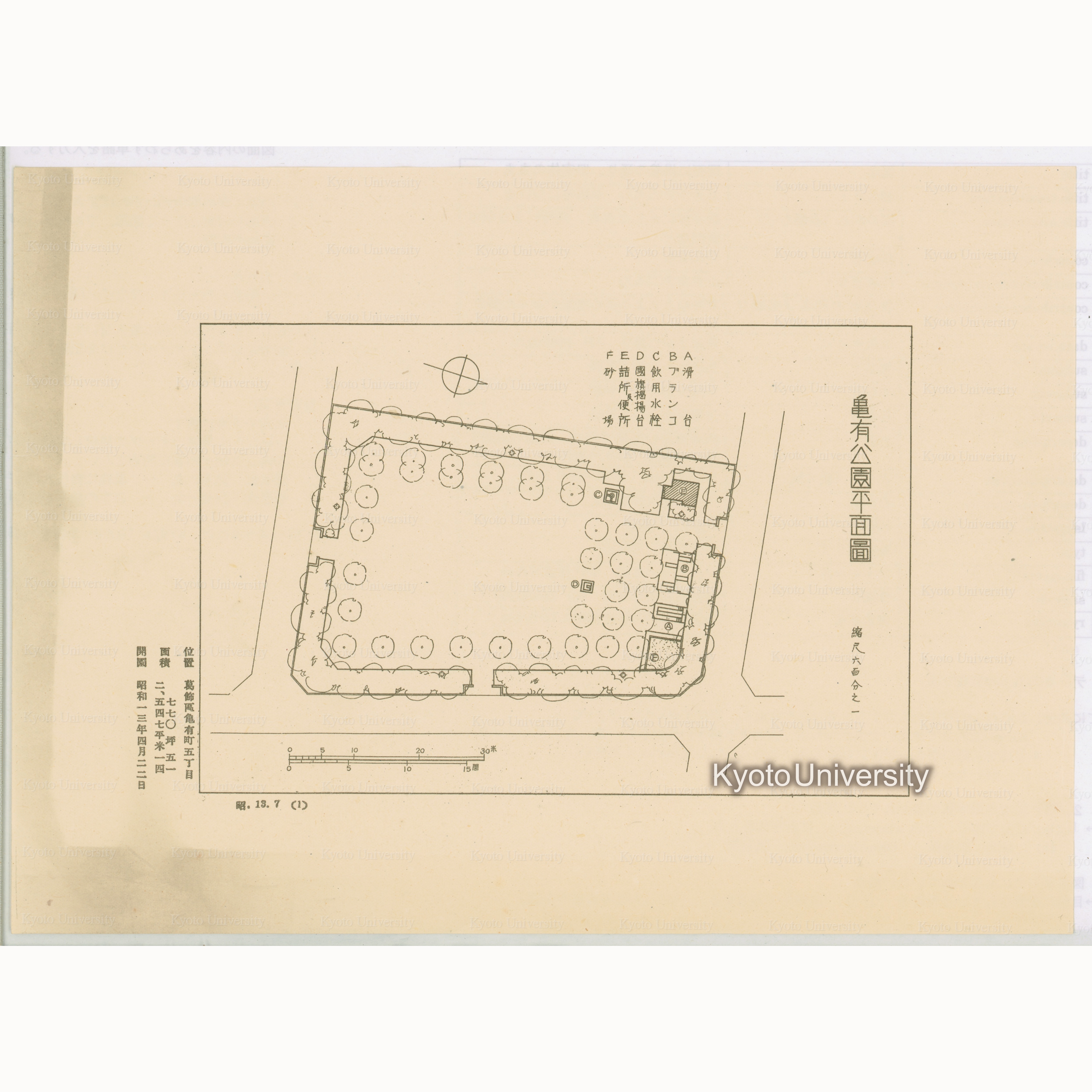 亀有公園平面図 縮尺六百分之一 位置:葛飾区亀有町五丁目 面積:七七〇坪五一 二、五四七平米一四 開園:昭和一三年四月二二日 昭.13.7(1) (1)