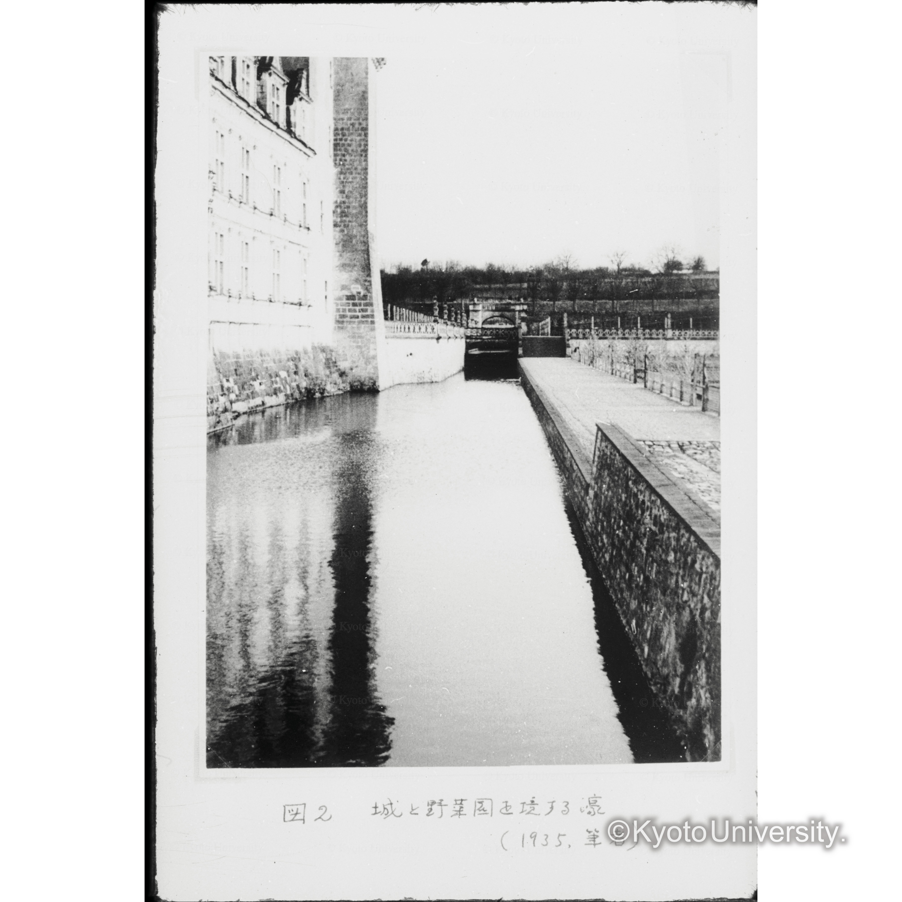 城と野菜園を境する濠, 1935. [スライド写真への撮影の日付は不明.]. [1935年.]