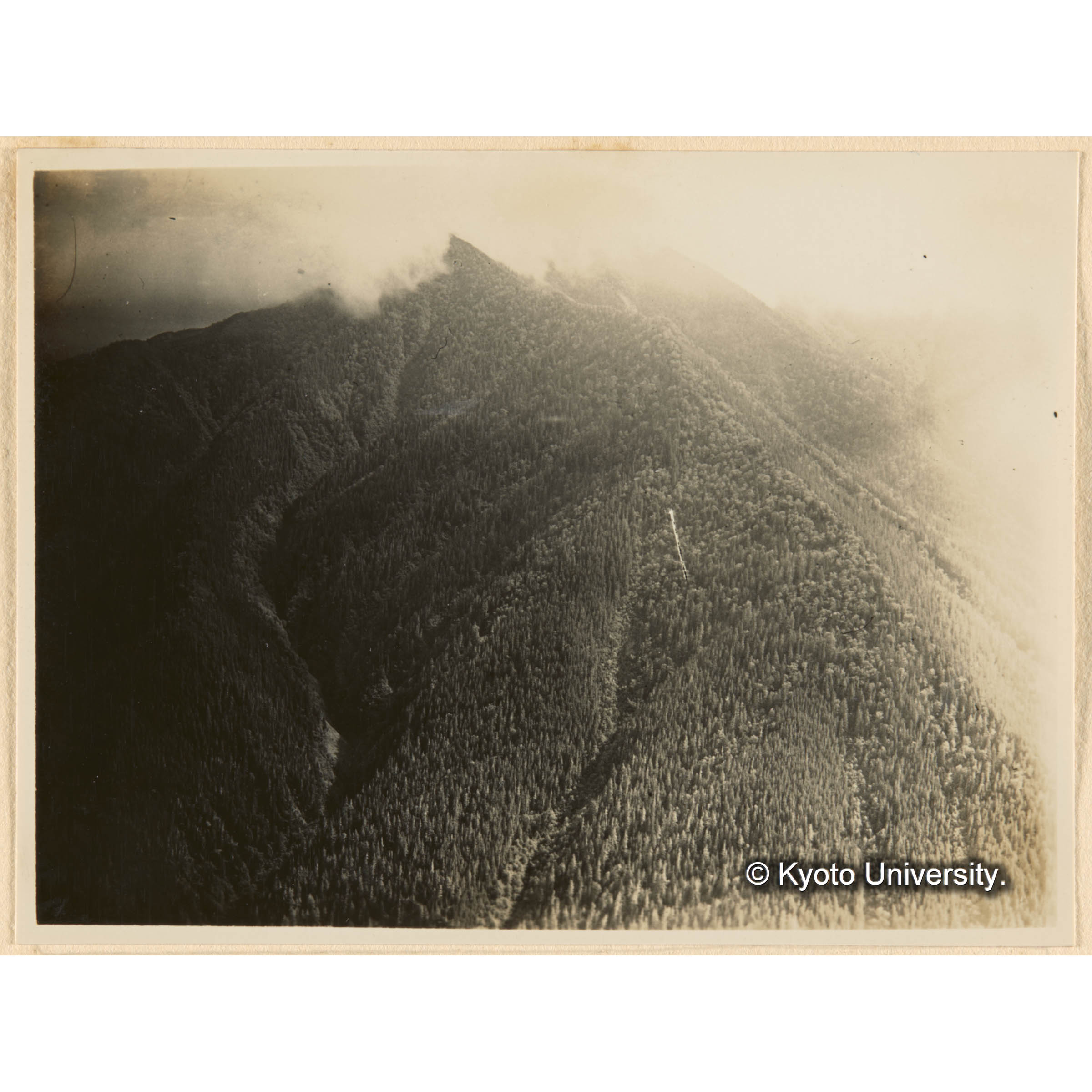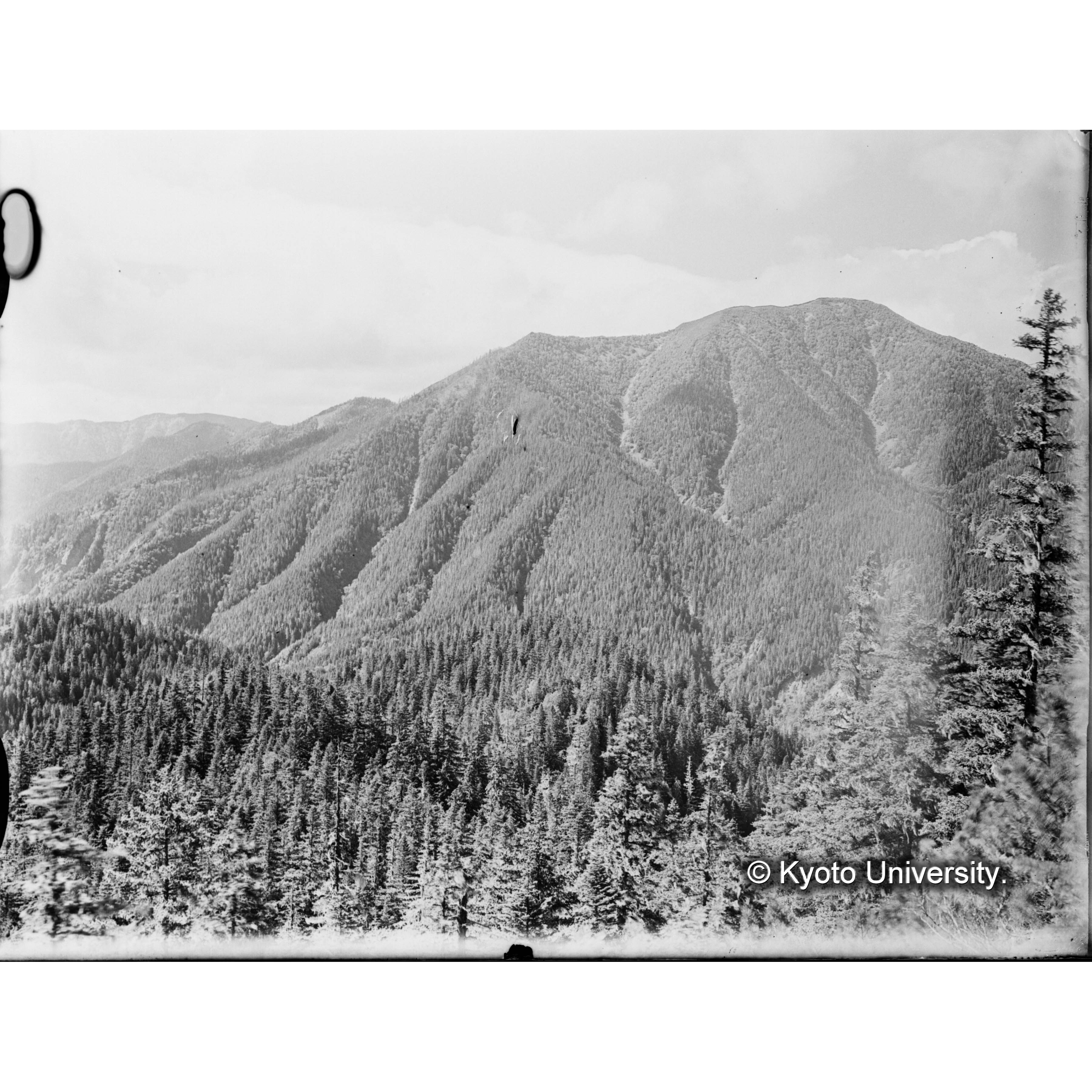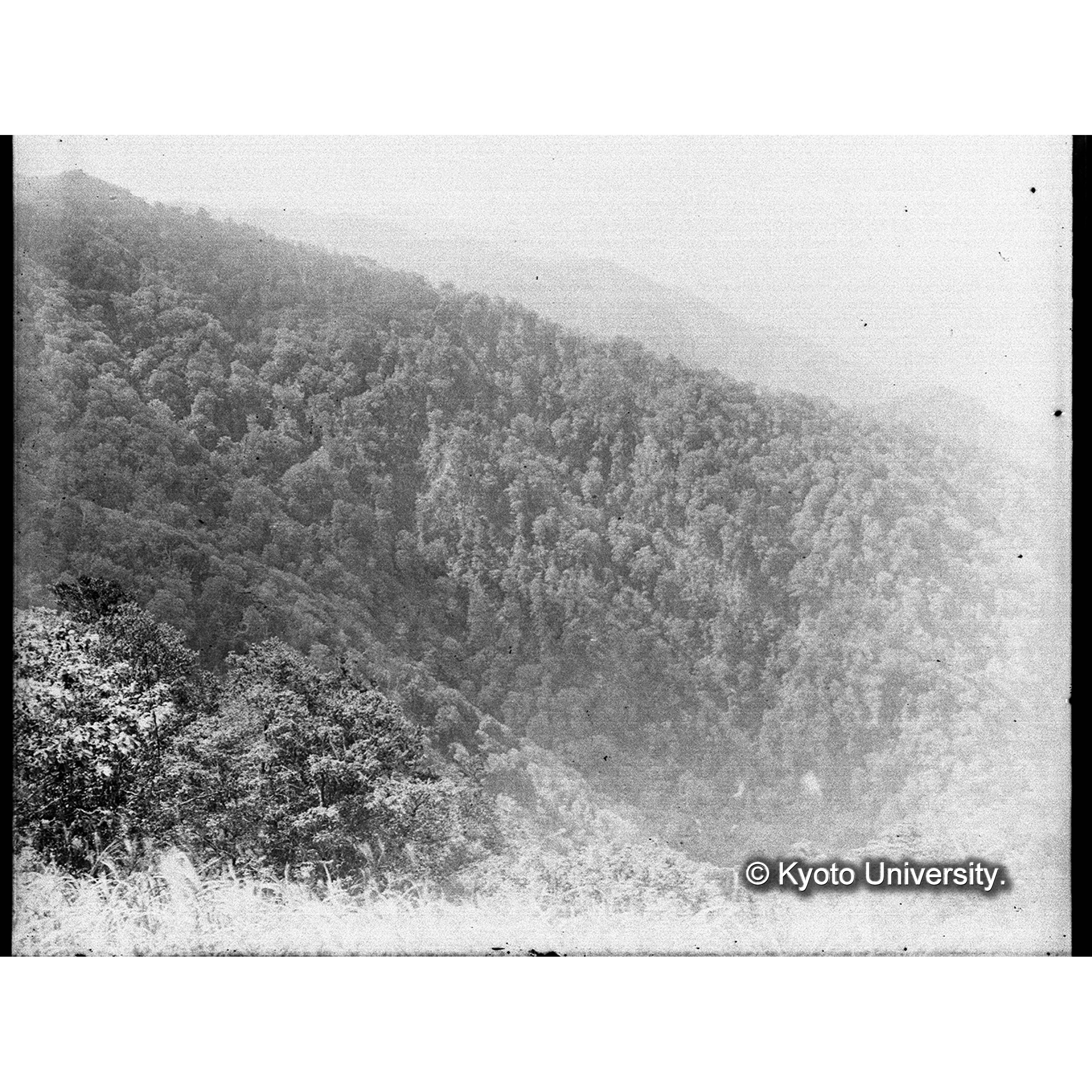 亜屯望樓上(地上32m)ヨリ亜屯川畔闊葉樹林を距テテ亜屯山(左方)ヲ望ム、亜屯山ノ右方ノ山ノ腹面白ク見エルハ國有林(気屯)ノ皆伐跡地 (1)