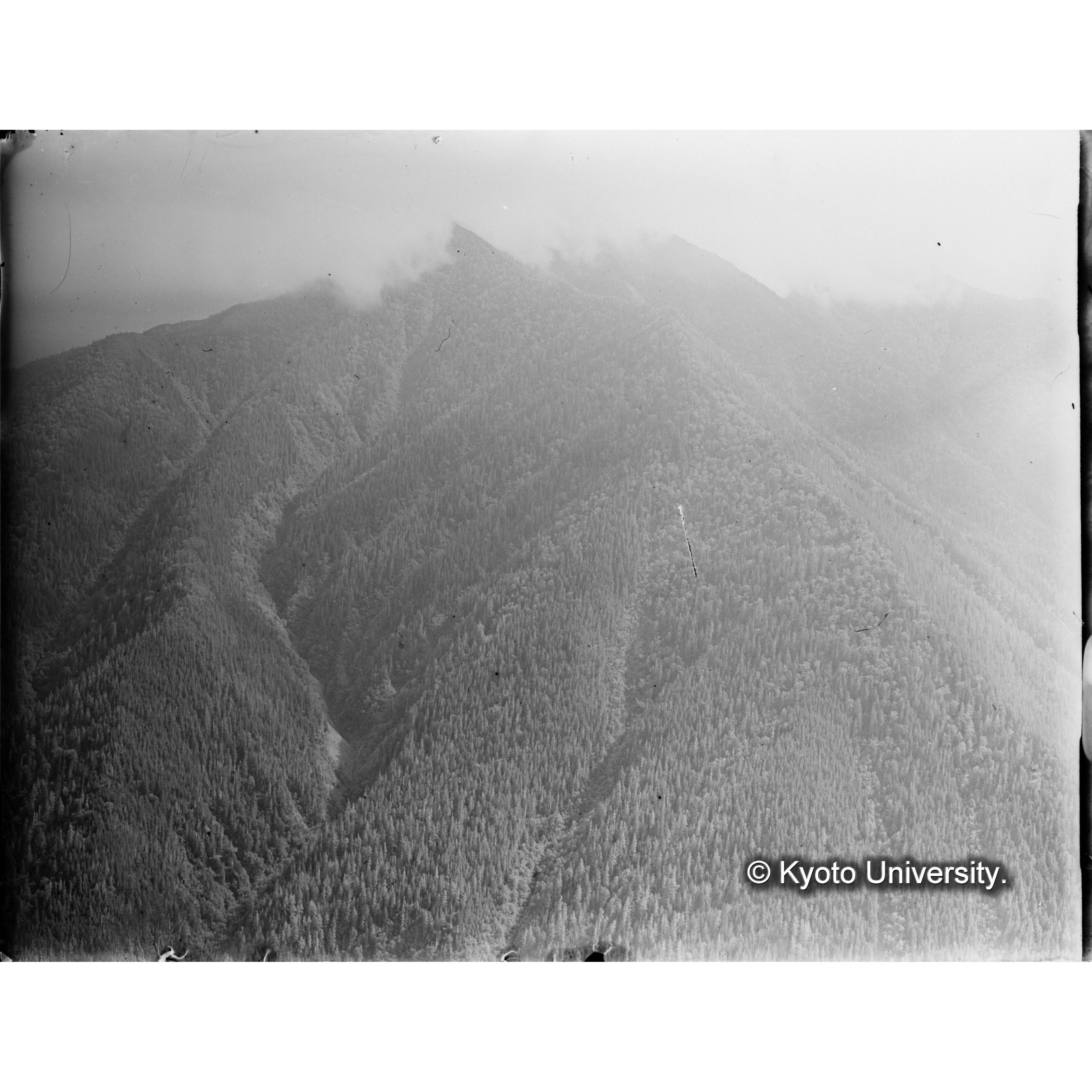 亜屯、前ノ沢流域峰通(海抜髙501m)ヨリ 田栗沢(伐跡)一ノ沢流域(天然林)ヲ望ム 中央ハ亜屯川 黒キ部分ハ雲ノ影 (1)