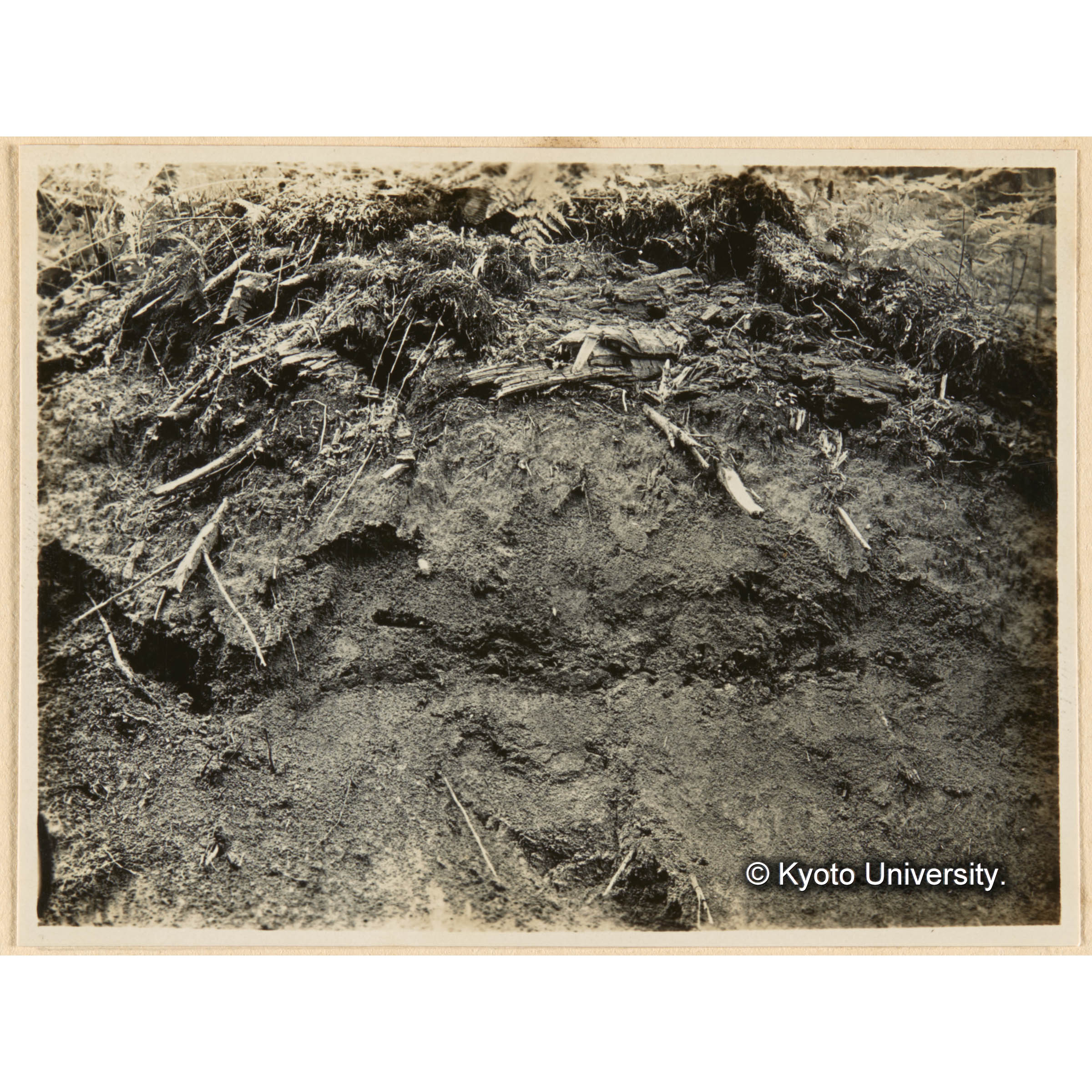 亜屯、えぞまつ、とどまつ混淆天然林ニ於ケル表土層下(約20cm)ノ木炭粉層(×印) (1)