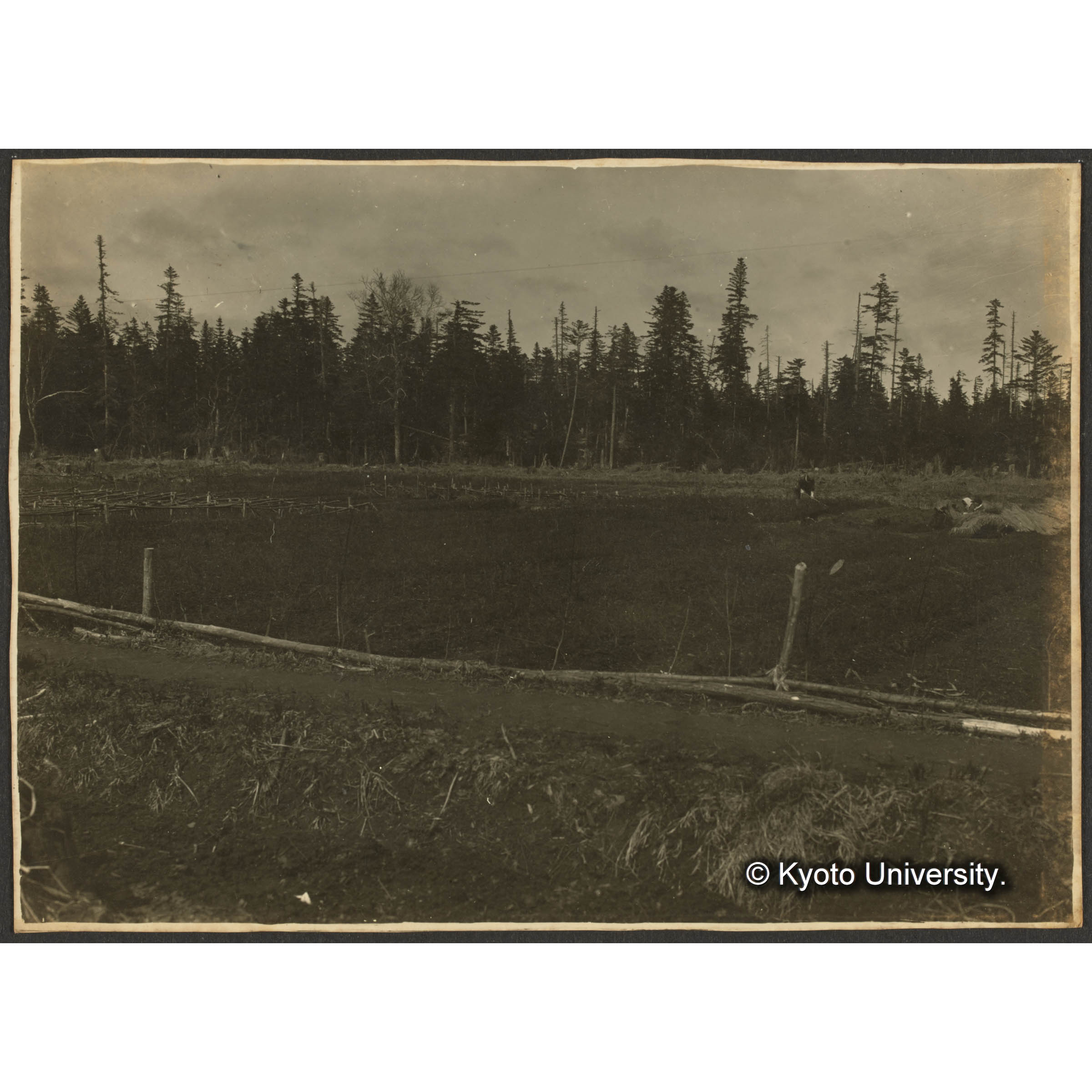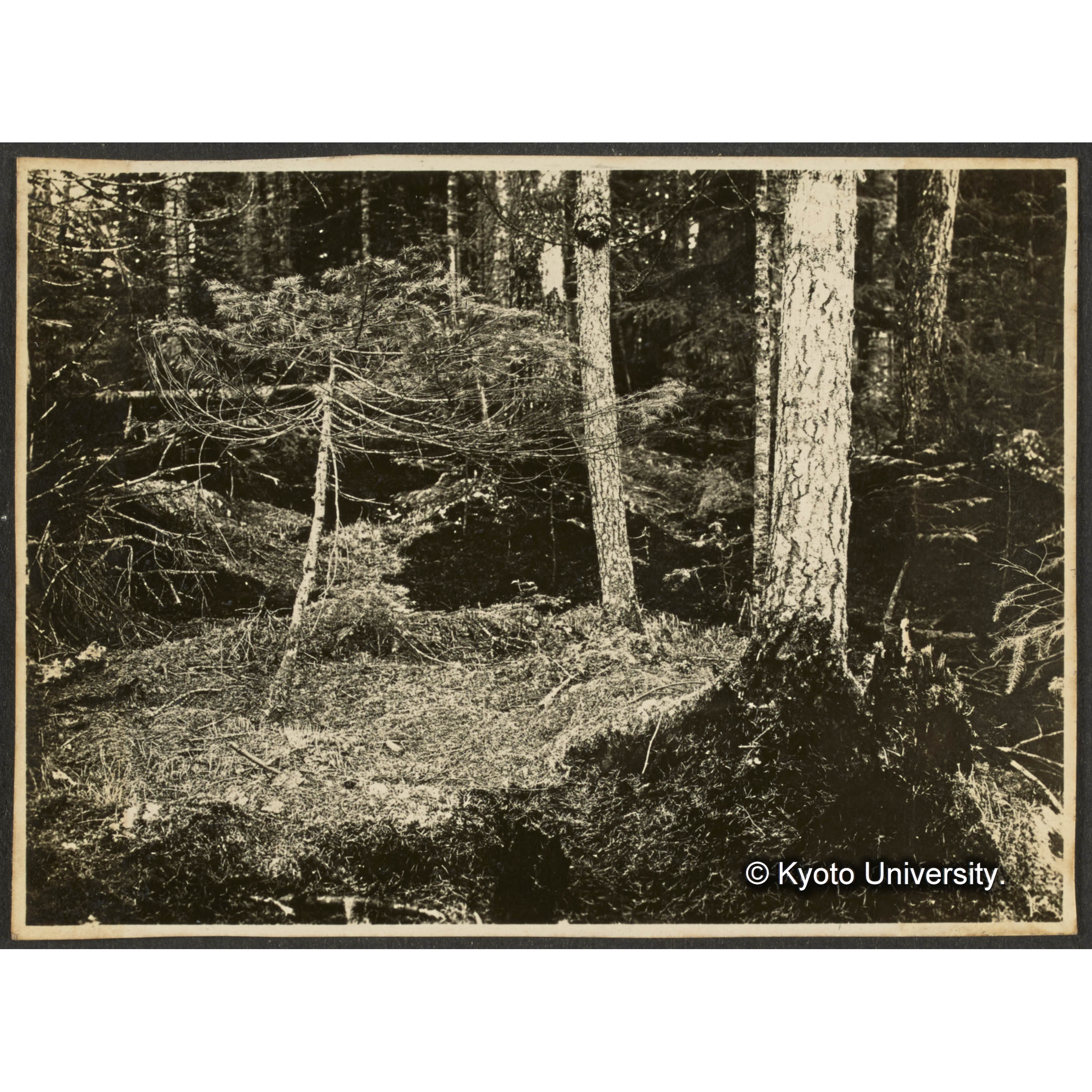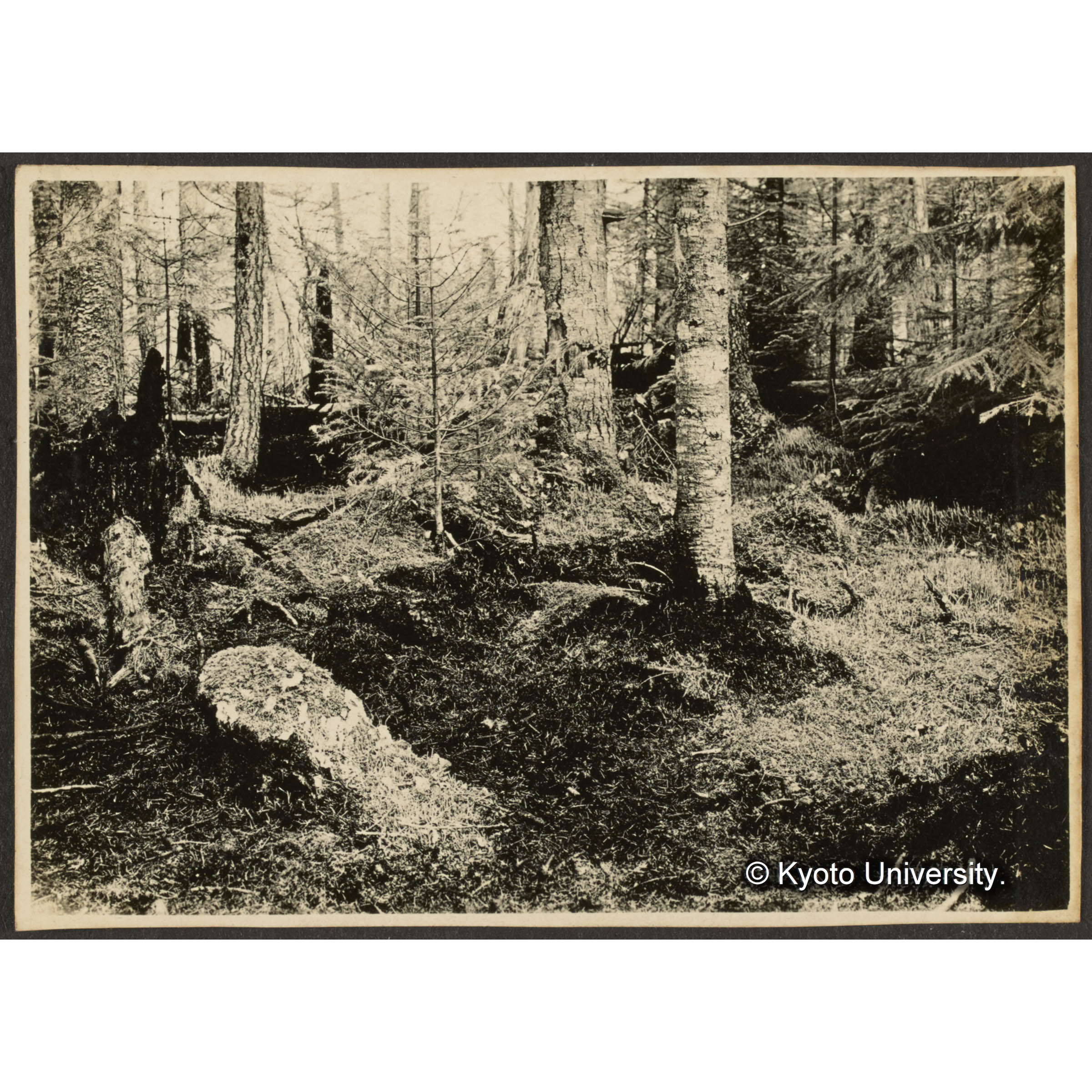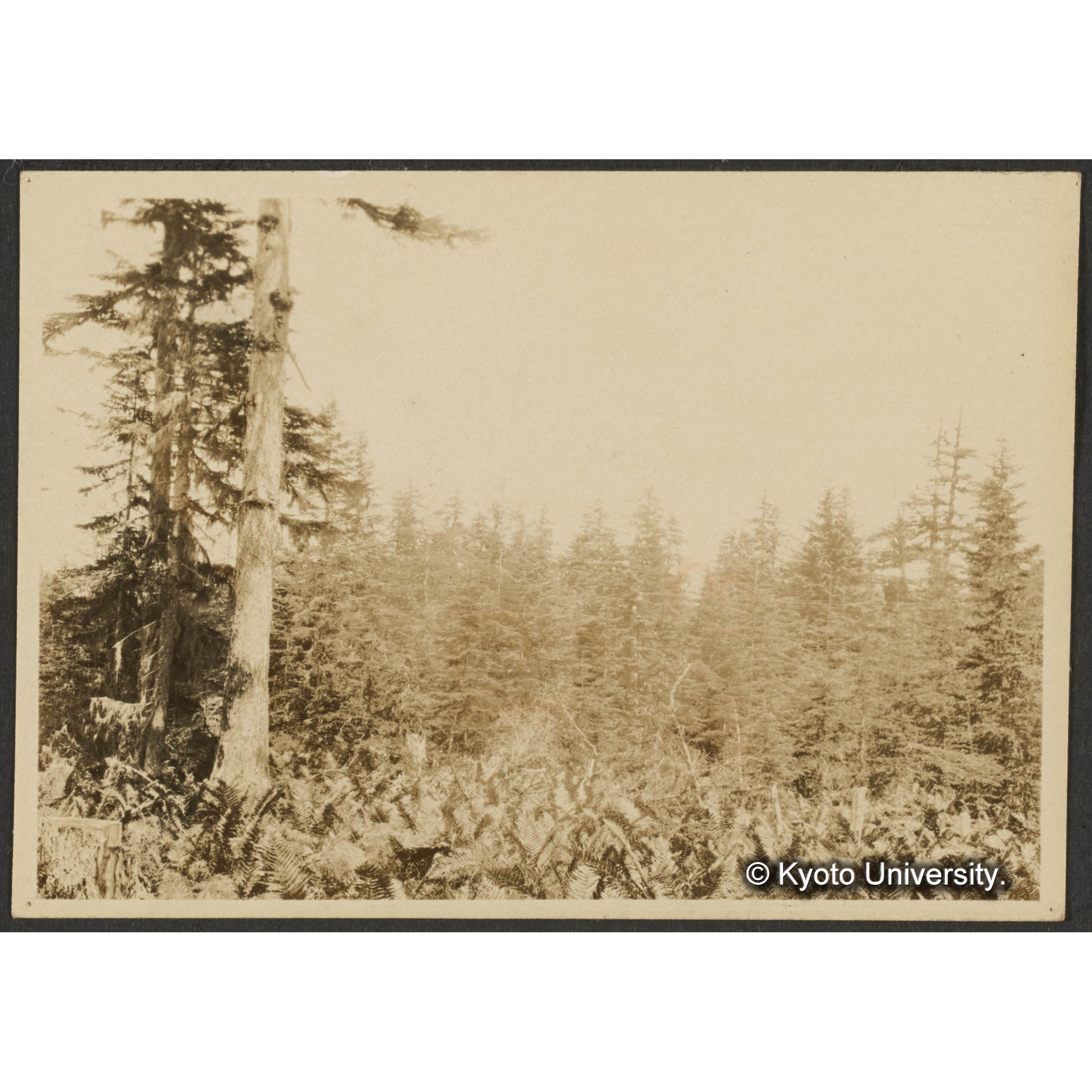 [写真]古キ伐採跡地に立てるエゾマツ、トドマツ、グイマツ (伐採後約30年)? 前面ヤマドリゼンマイの生ぜる個所は境界伐開線なり (1)