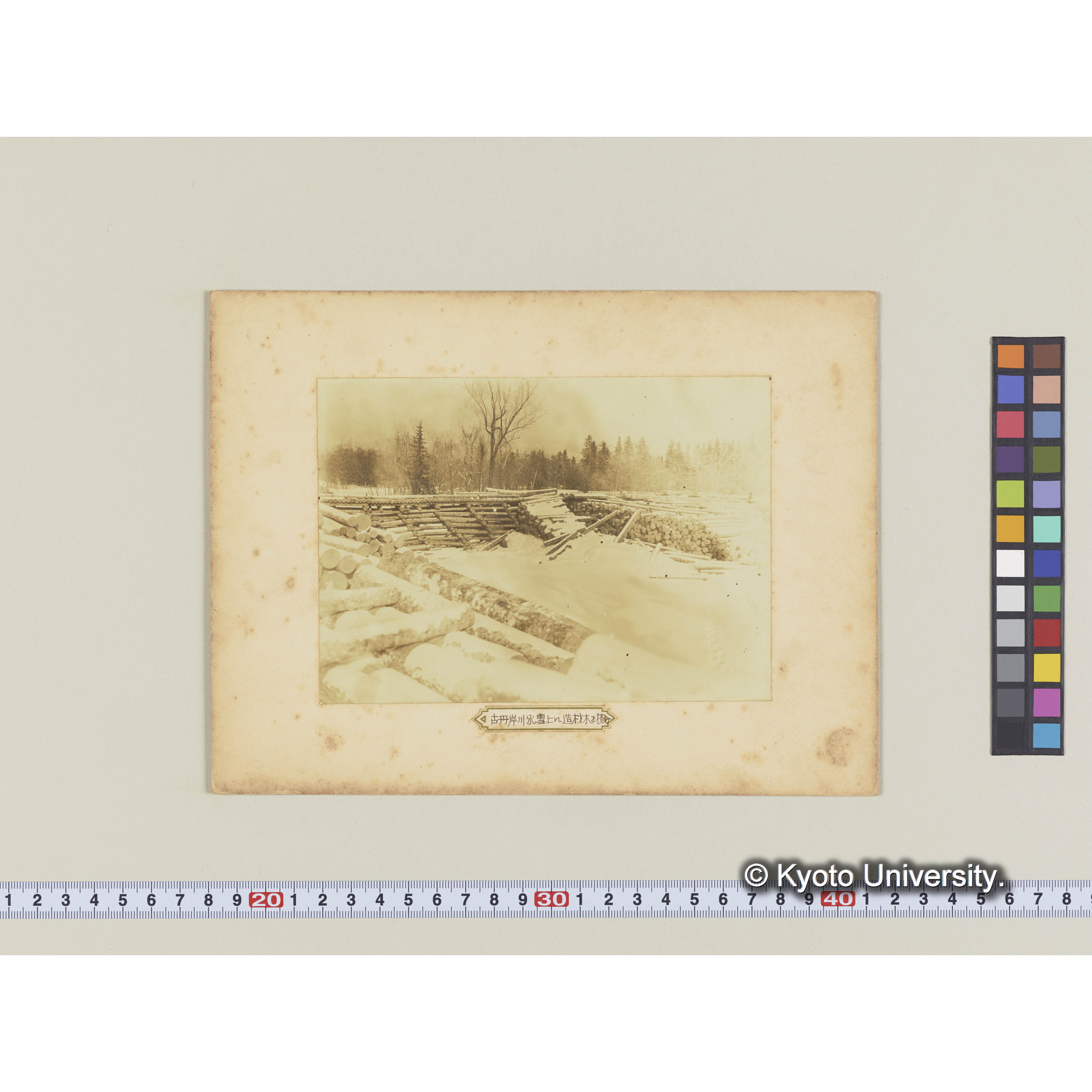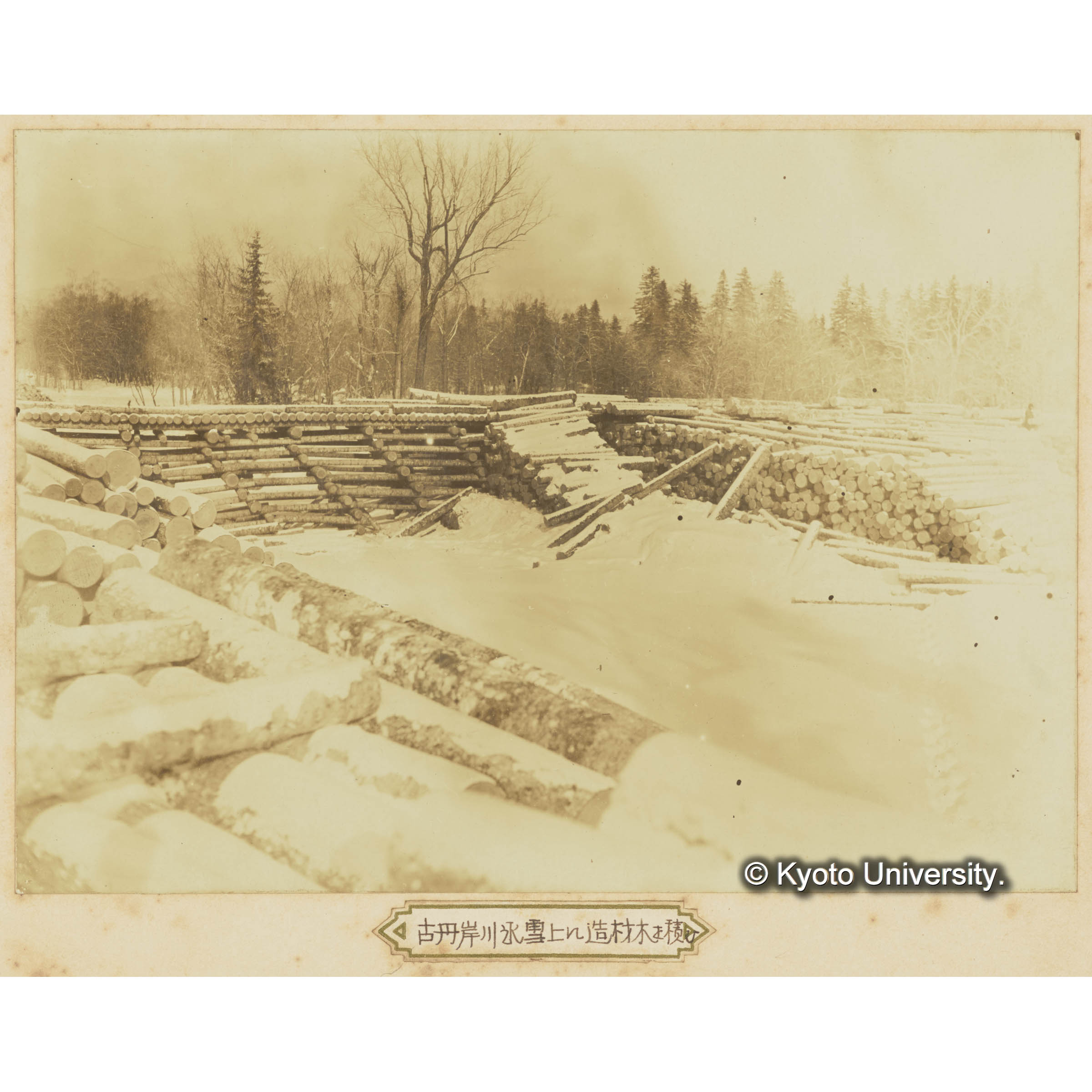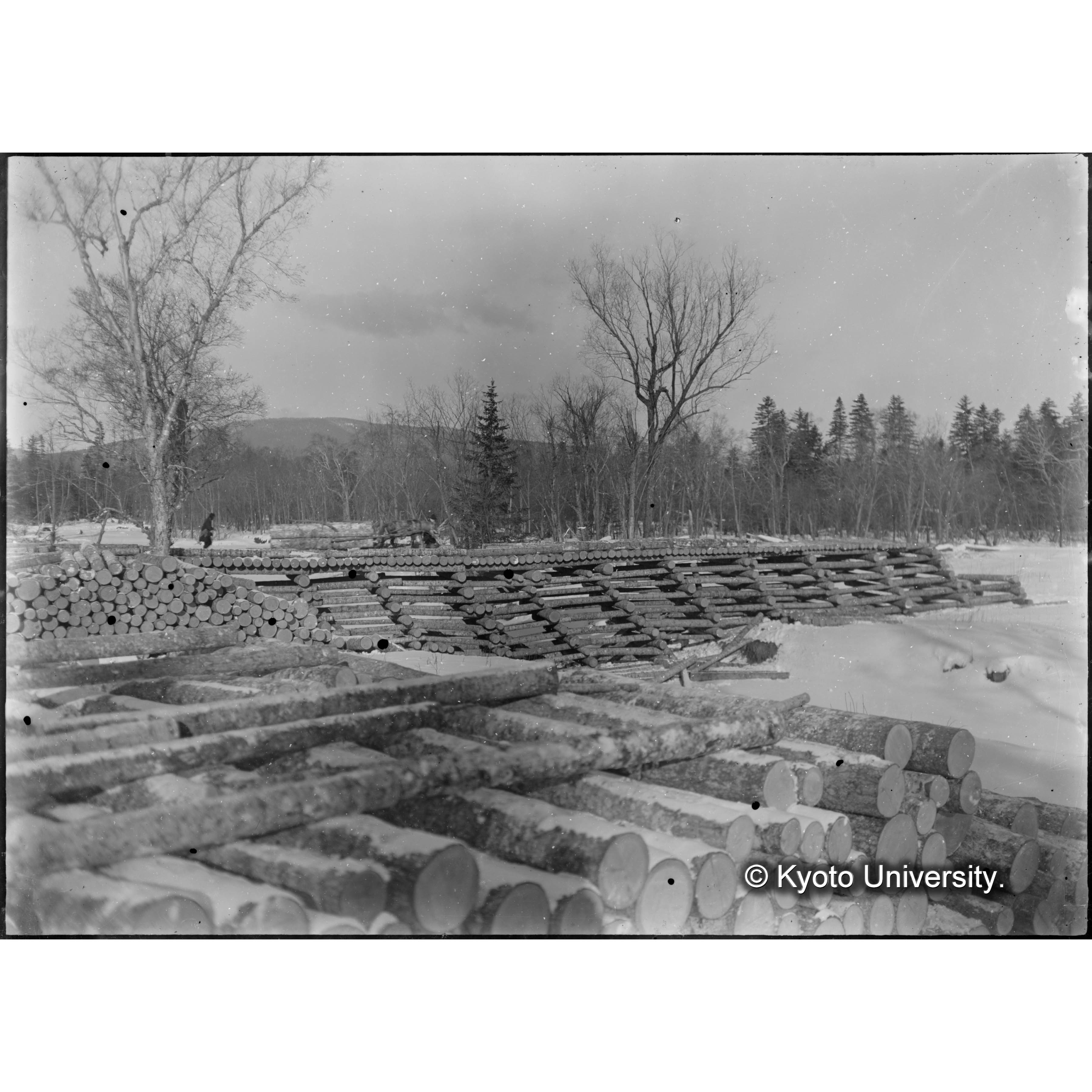 古丹岸川氷雪上に造林木を積揚げたる光景樺太保存写真 (1)