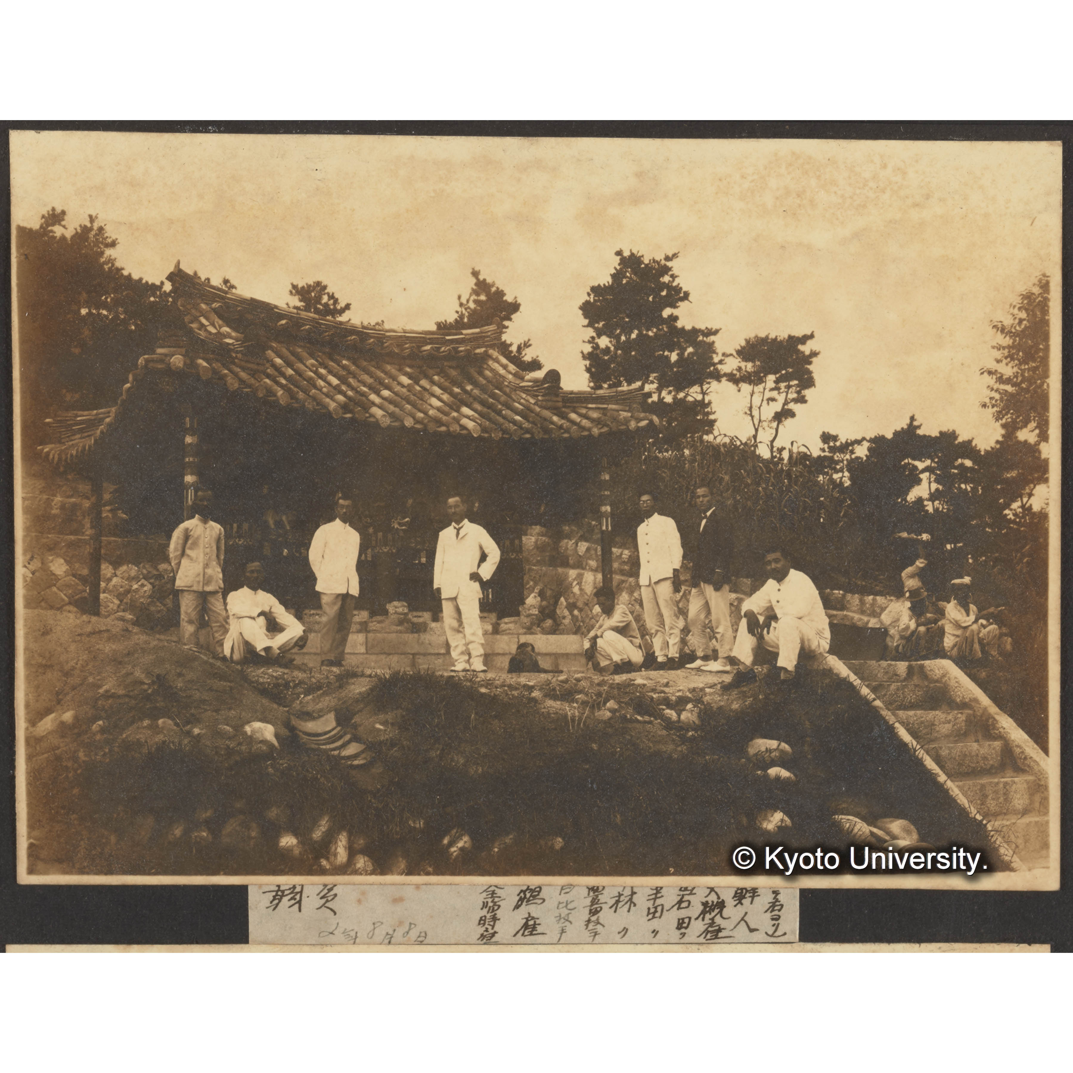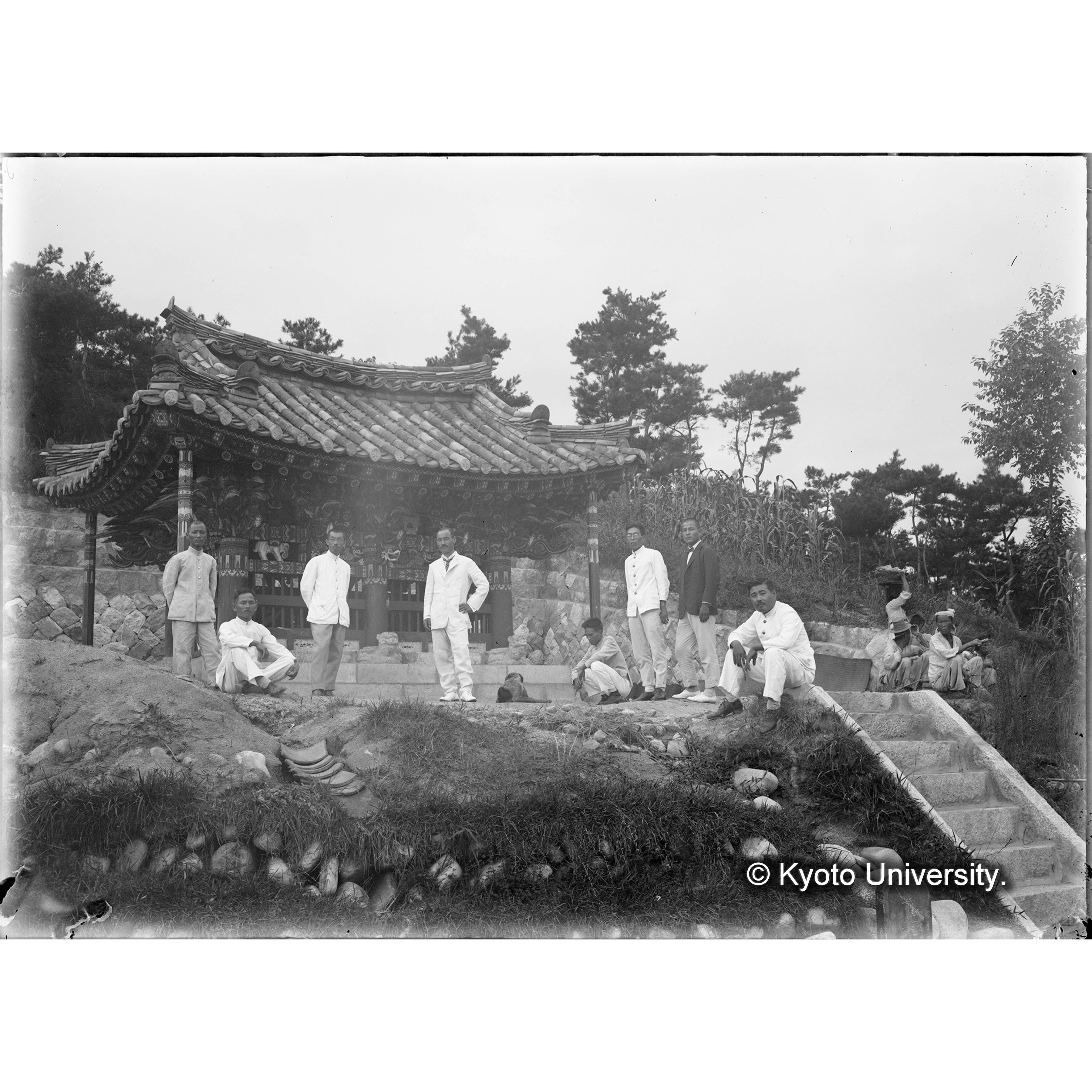 朝鮮演習林付近領徳碑及演習林職員(向テ右ヨリ)鮮人、大槻雇、岩田雇、半田〔史郎〕雇、林雇、豊田〔三郎〕技手、日比〔昌〕技手、鶴雇、全臨時雇 (1)