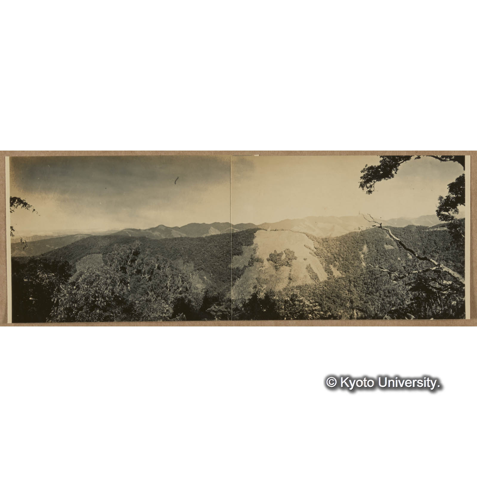 朝日山北肩より見たる藤枝,中心崙間の植相。中央には拡き草生地,左端には六角形の焼跡が見える。右端に僅かに伐採された一区画があるがそれは藤枝駐在所である (1)