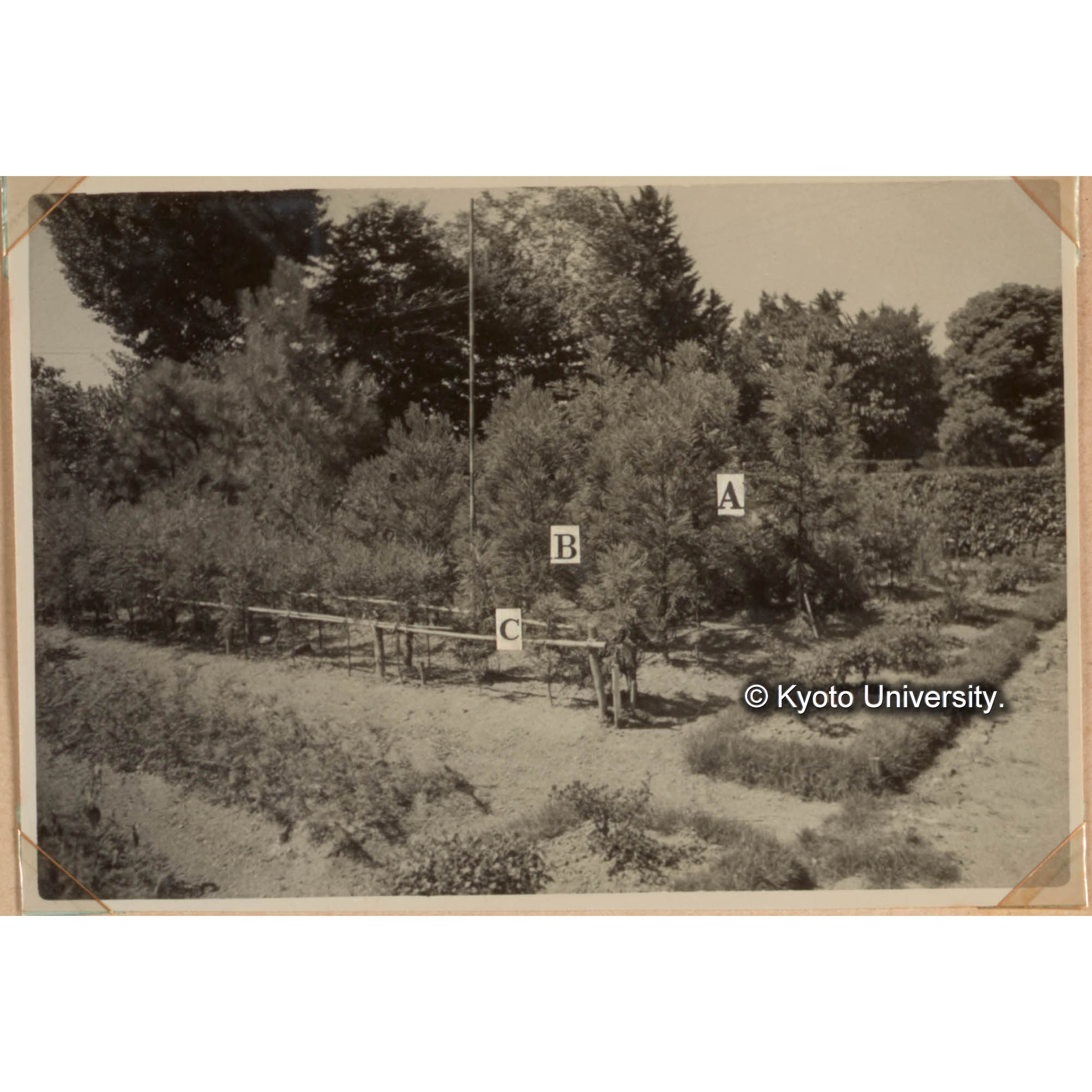 林木育種に関する試験 スギのクローン。 地方品種の蒐集調査試験 A:クモトオシ。1951の挿木 B:ミヤマノホマレ 福田孫多氏 C:福田孫多氏よりのクローン一群 (1)