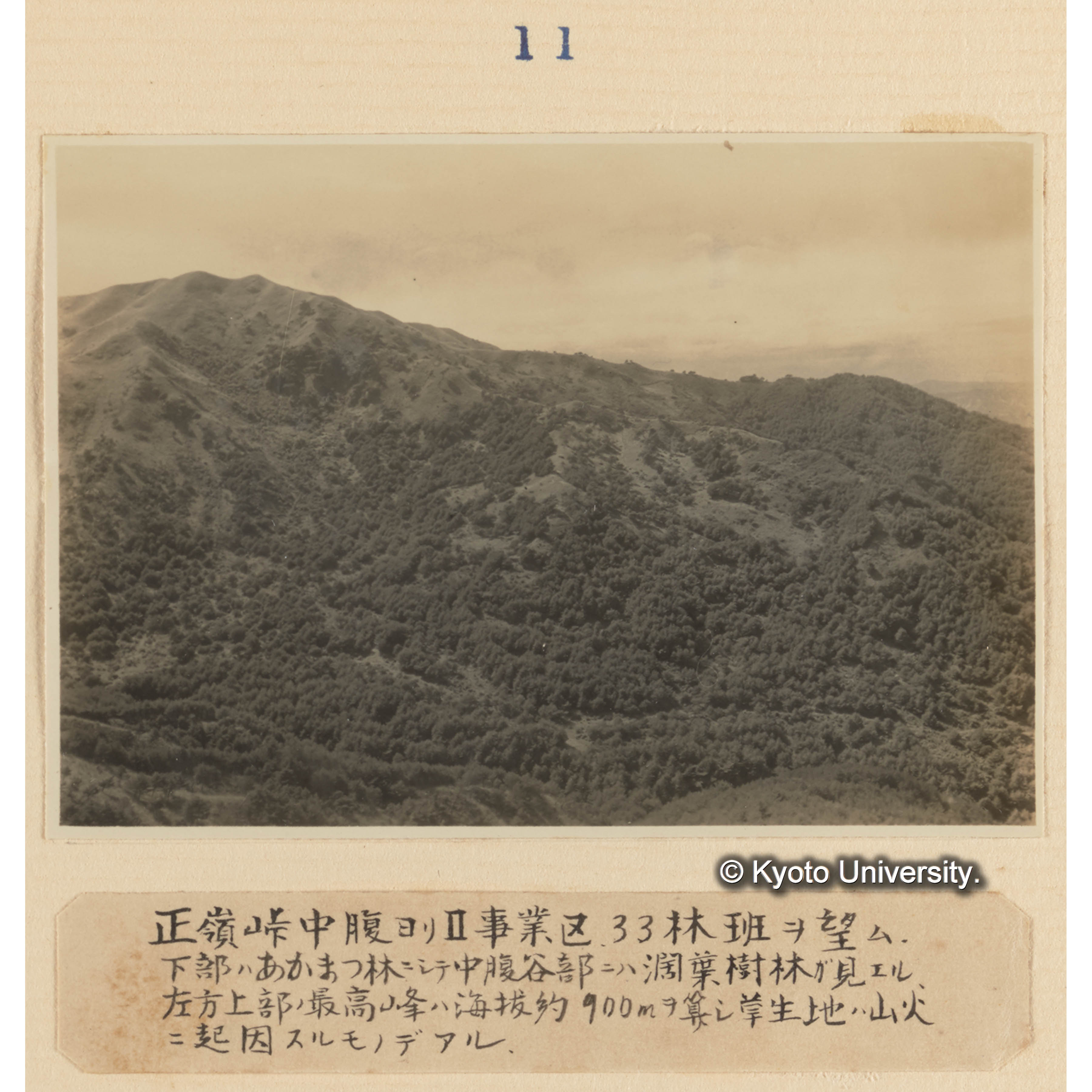 正嶺峠中腹よりII事業区。33林班を望む/下部はアカマツ林にして中腹谷部には闊葉樹林が見える、左方上部の最高峰は海抜約900mを算し草生地は山火に起因するものである (1)