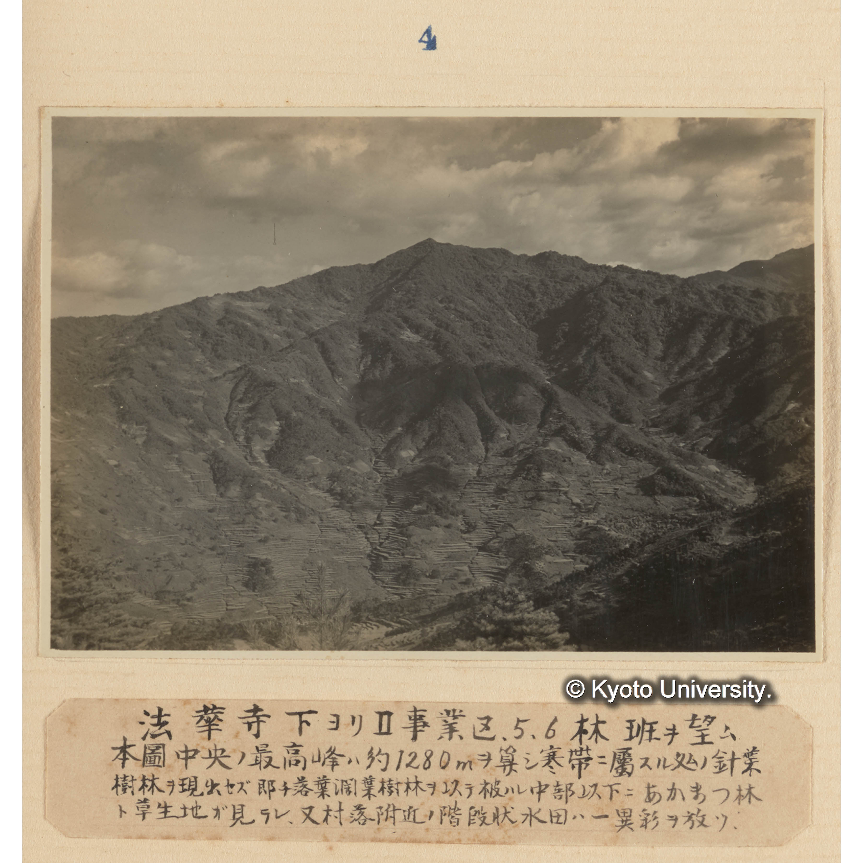 法華寺下よりII事業区、5、6班を望む/本図中央の最高峰は約1280mを算し寒帯に属する処の針葉樹林を現出せず即ち落葉闊葉樹林を以て被われ中部以下にアカマツ林と草生地が見られ、又村落附近の階段状水田は一異彩を放つ (1)