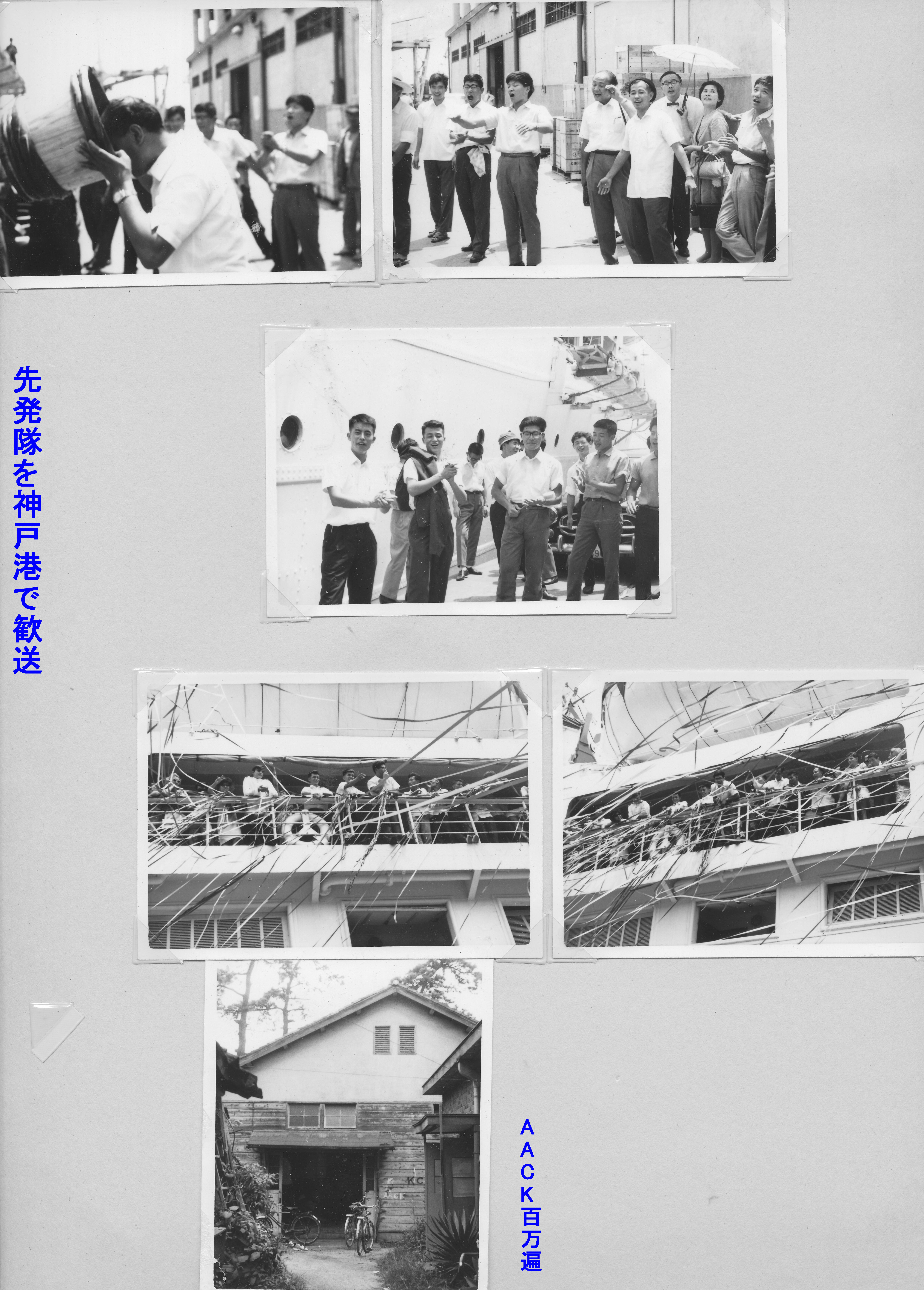 先発隊(吉野・島田・木村)を神戸港で歓送。下:百万遍のAACK事務所 (1)