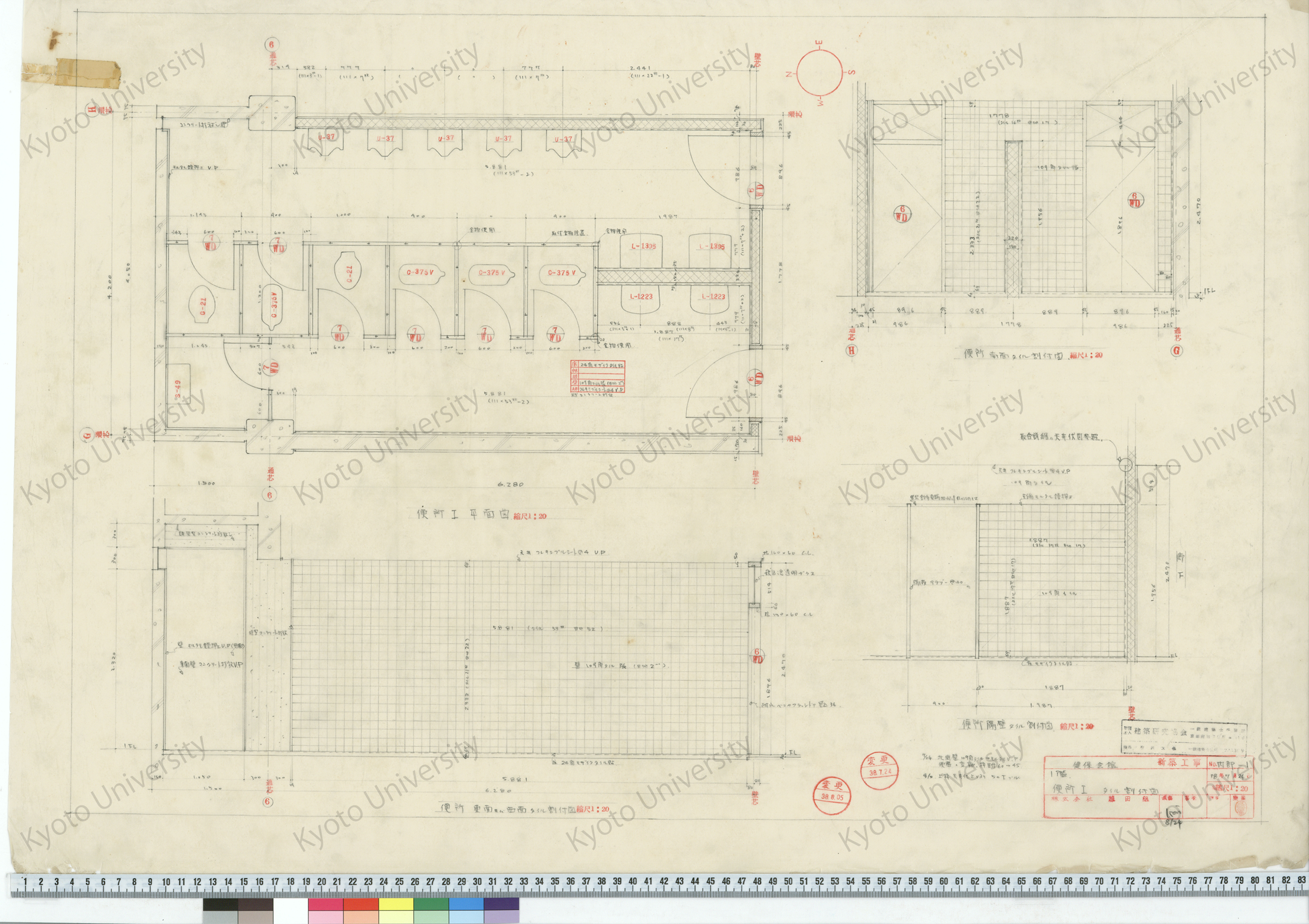 健保会館新築工事_2階便所平面図 東, 西, 南北面タイル割付図_1:20_内部-2_38年6月7日_桑原, 増田友也(担当) (1)
