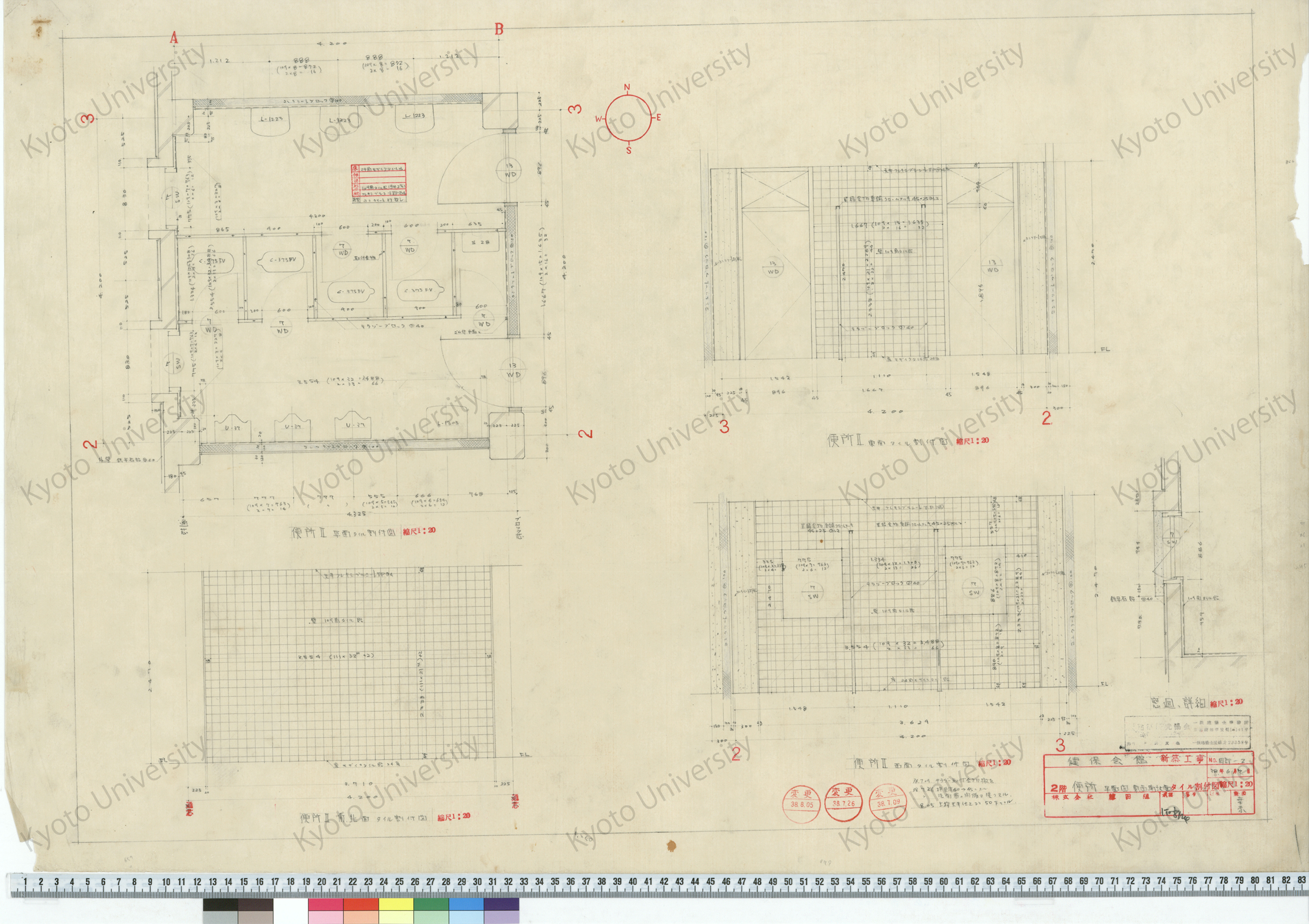 健保会館新築工事_2階便所平面図 東, 西, 南北面タイル割付図_1:20_内部-2_38年6月7日_桑原, 増田友也(担当), 1963-06-07