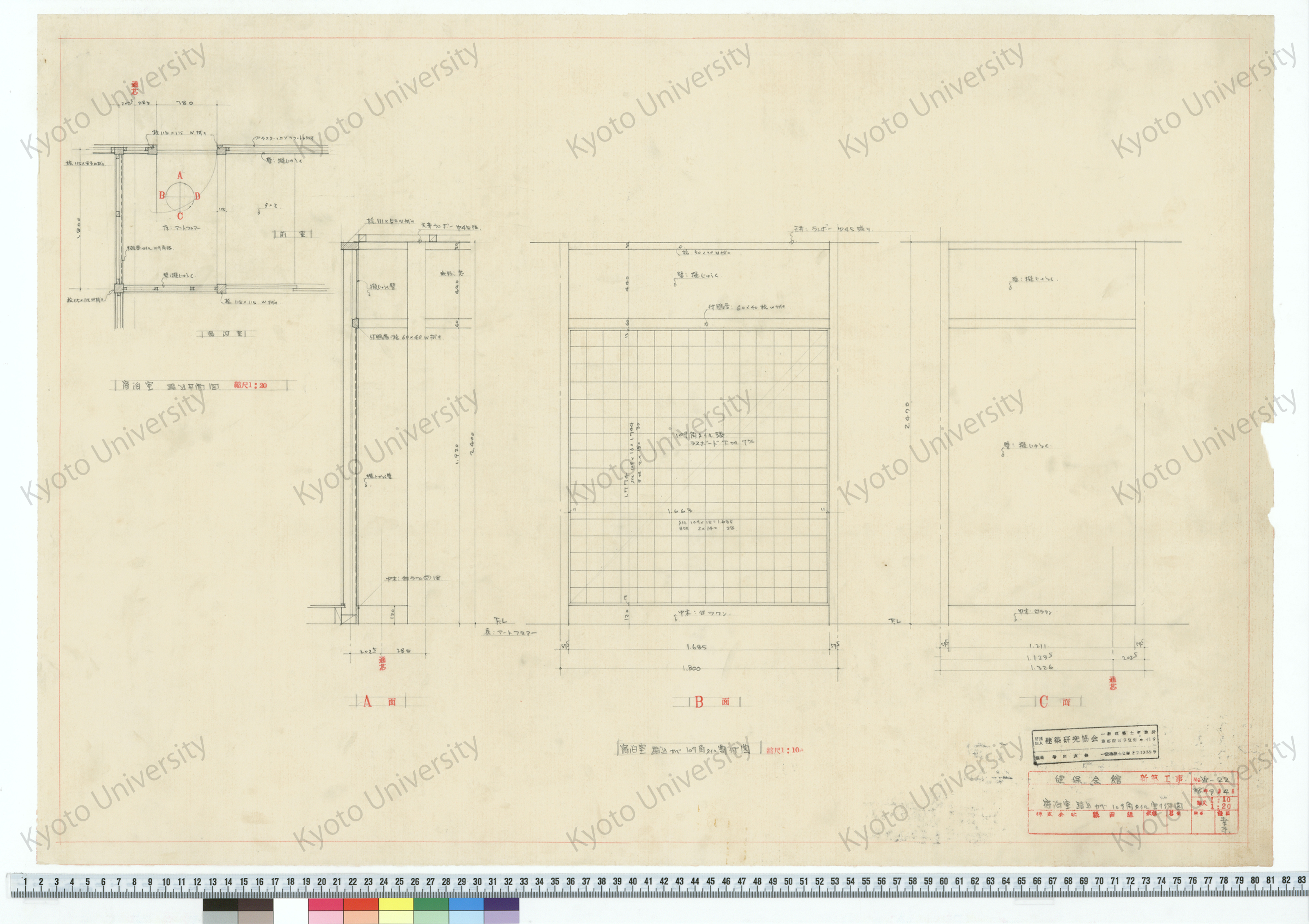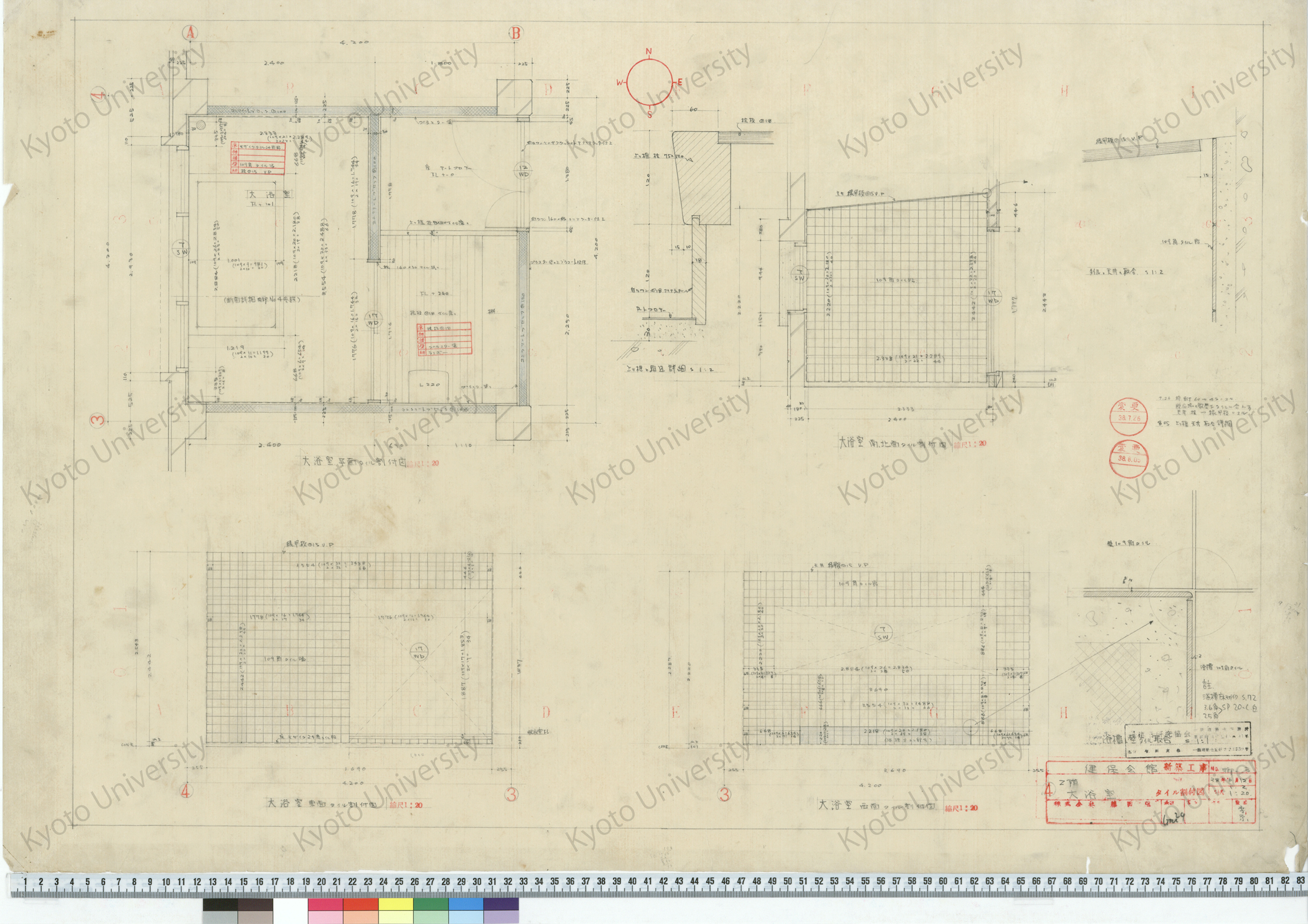 健保会館新築工事_宿泊室踏込カベ109角タイル割付図_1:10, 1:20_追-22_38年8月4日_桑原, 増田友也(担当), 1963-08-04