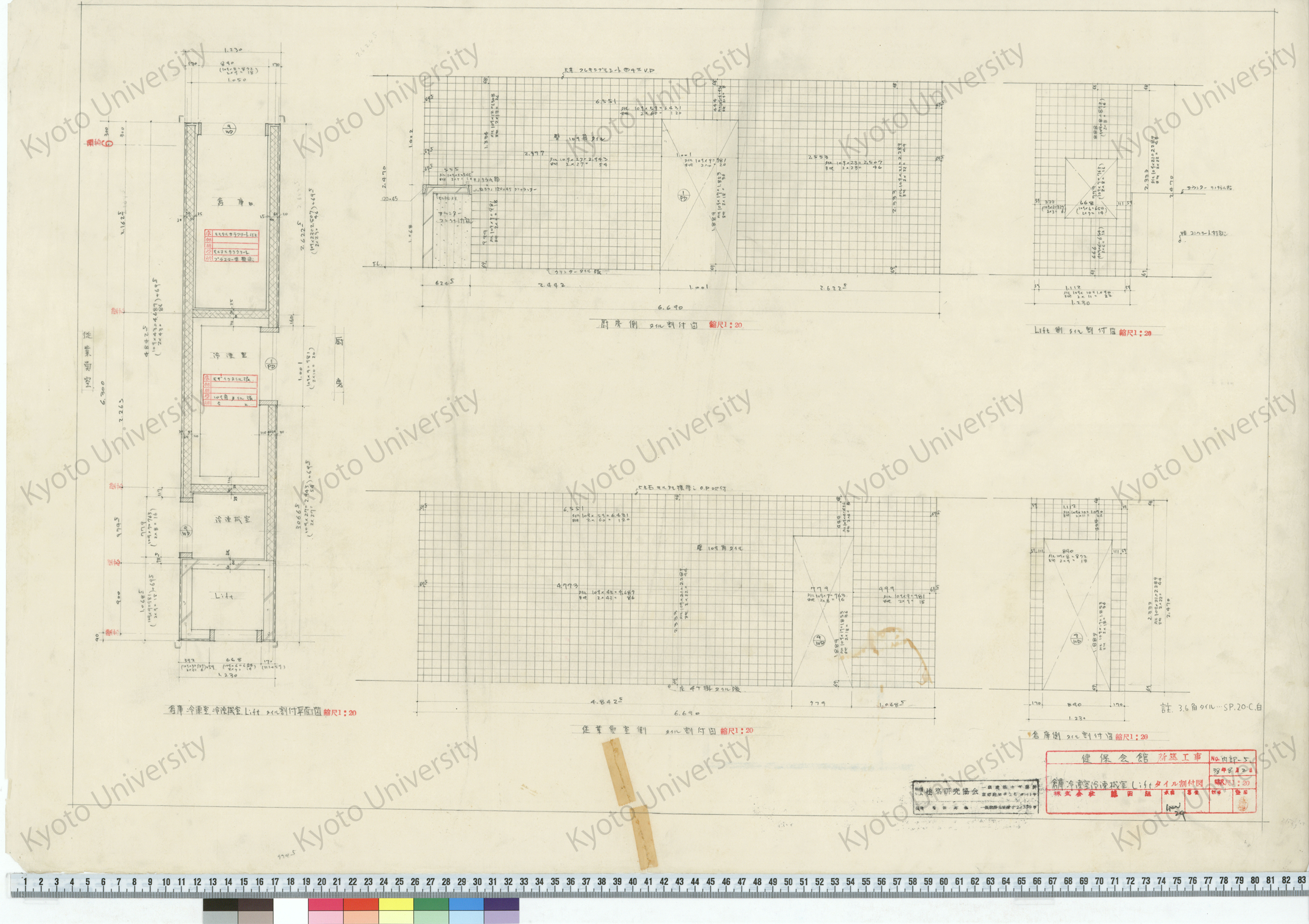 健保会館新築工事_倉庫冷凍室冷凍機室Liftタイル割付図_1:20_内部-5_38年8月2日_桑原, 増田友也(担当) (1)