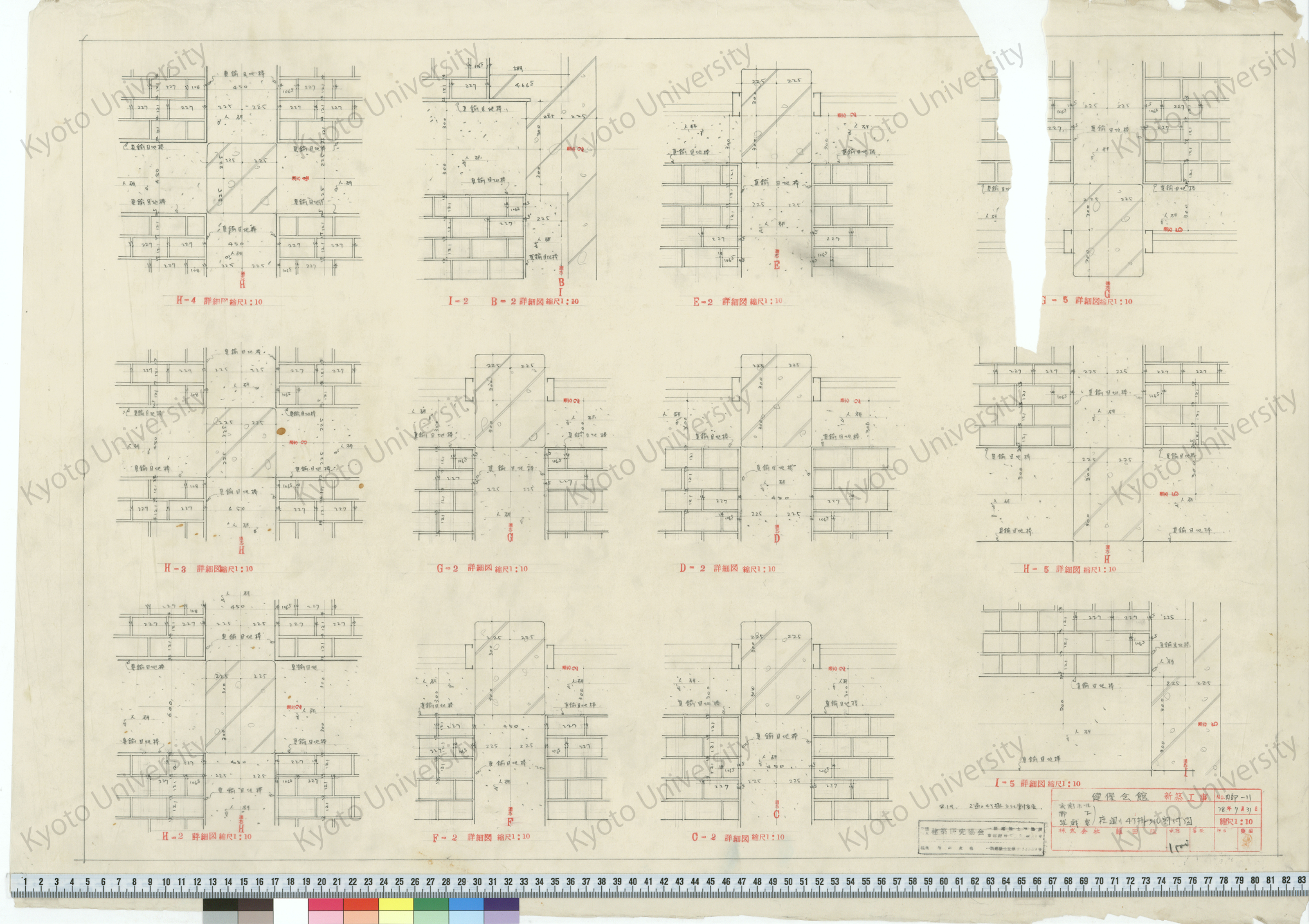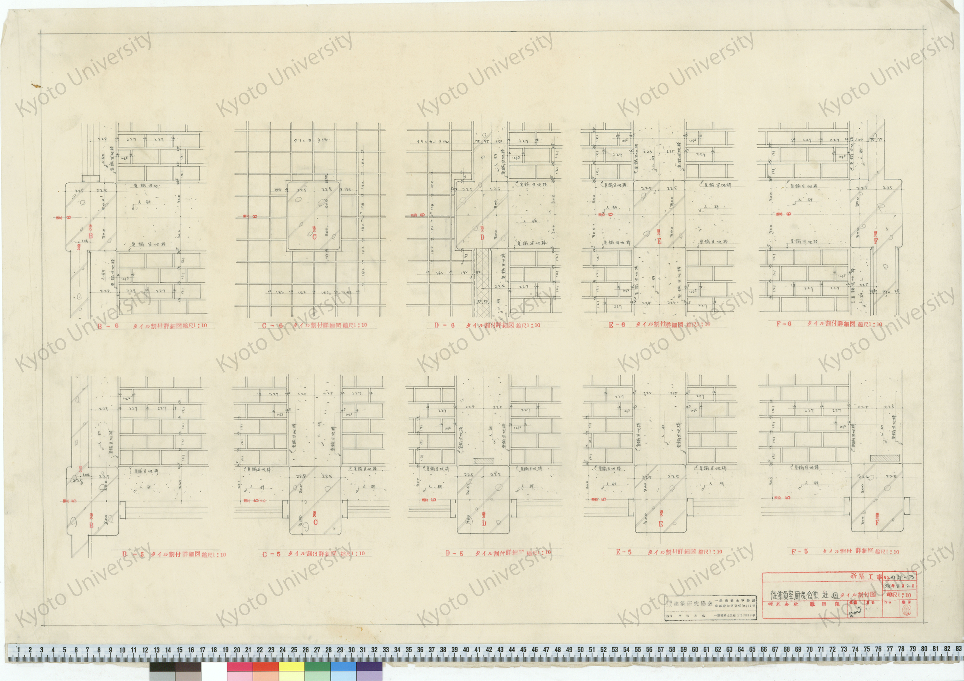 健保会館新築工事_宿泊室踏込カベ109角タイル割付図_1:10, 1:20_追-22_38年8月4日_桑原, 増田友也(担当) (1)