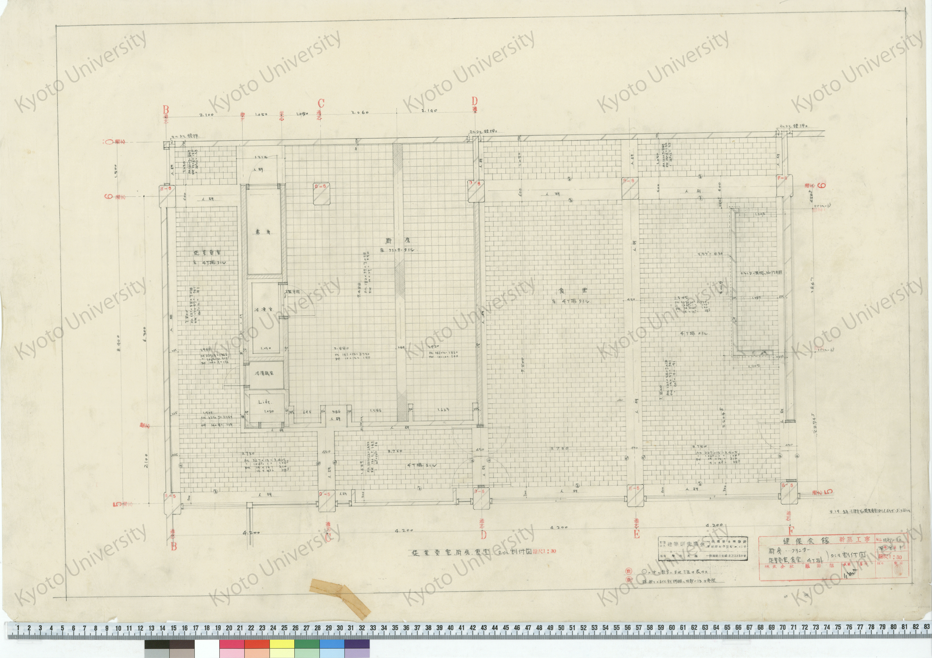 健保会館新築工事_厨房, クリンカー, 従業員室, 食堂, 4丁掛タイル割付図_1:30_内部-12_38年8月1日_桑原, 増田友也(担当), 1963-08-01