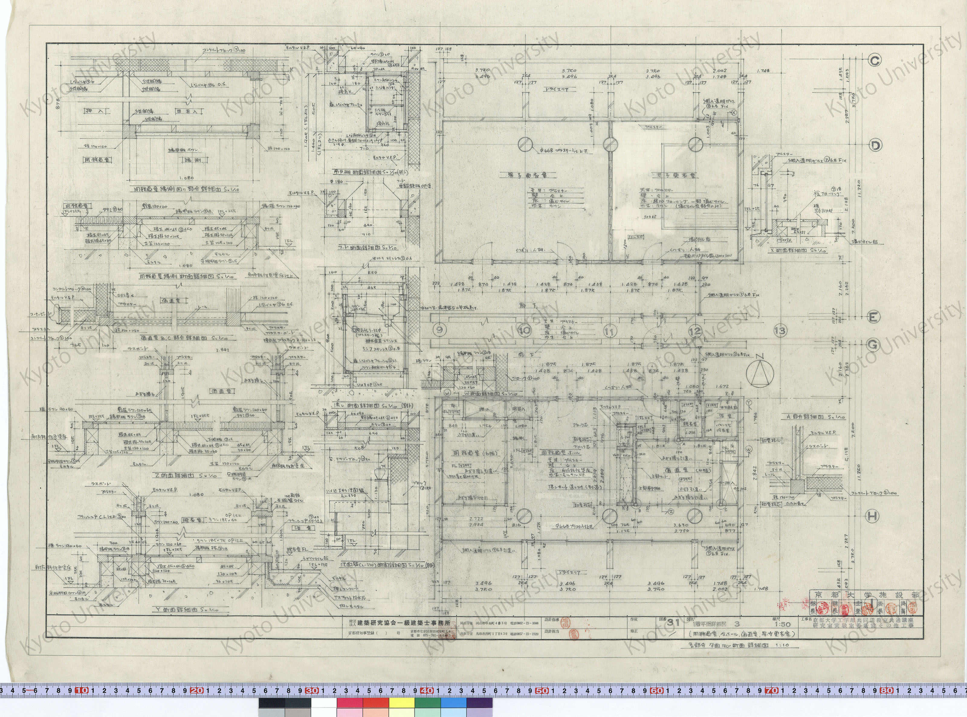 京都大学工学部共同講義室共通講座研究室実験室等新営その他工事_1階平面詳細図3(用務員室, 全ホール, 宿直室, 男女更衣室) 各部分平面及び断面詳細図_1:50, 1:10_31_増田(設計指導), 豊島 (1)