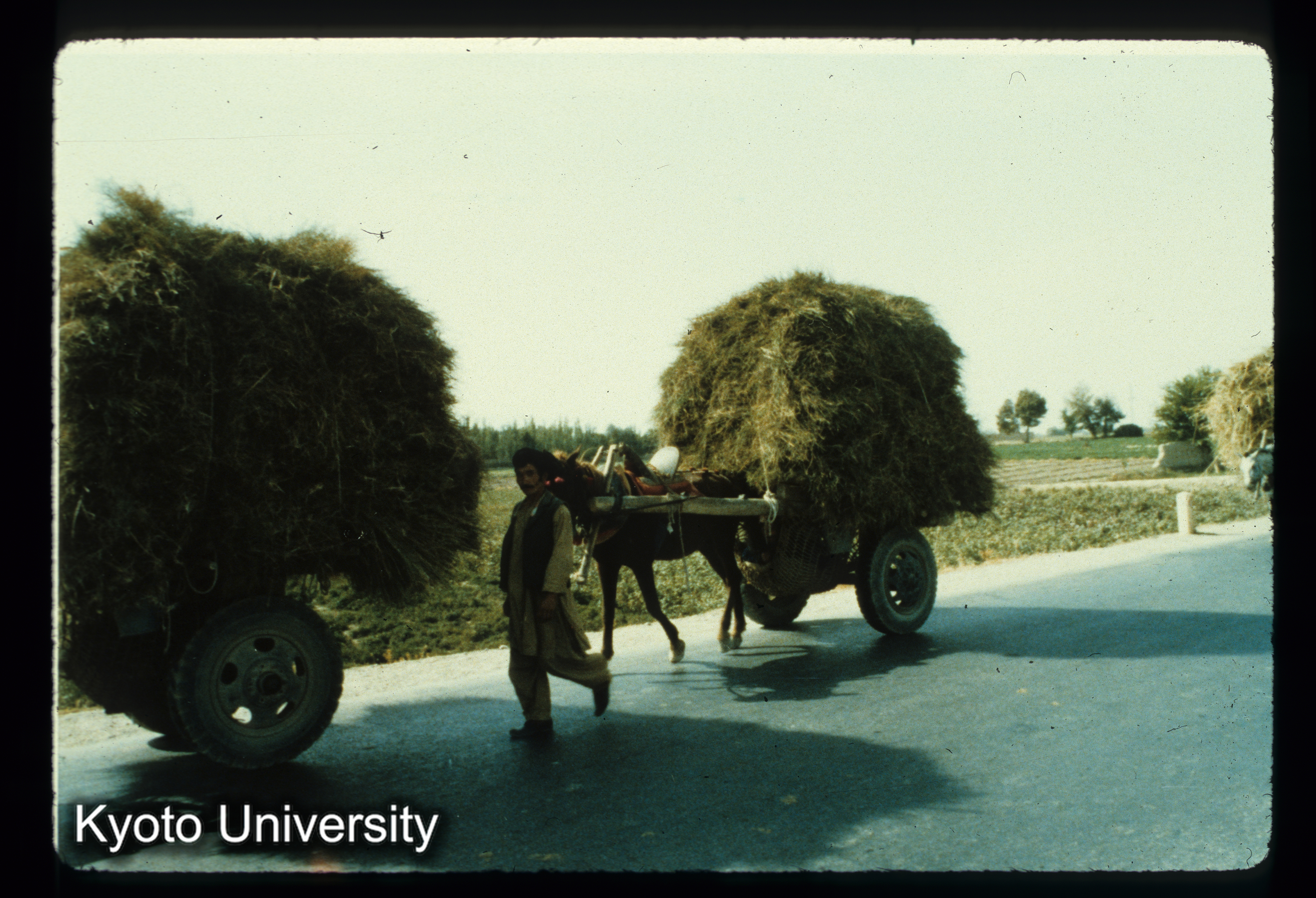 A93_Seihanから北へ向かうMasar-i Sharif付近 干し草を運ぶ5-6台の馬車 車輪間に吊すハンモックに人がねている (1)